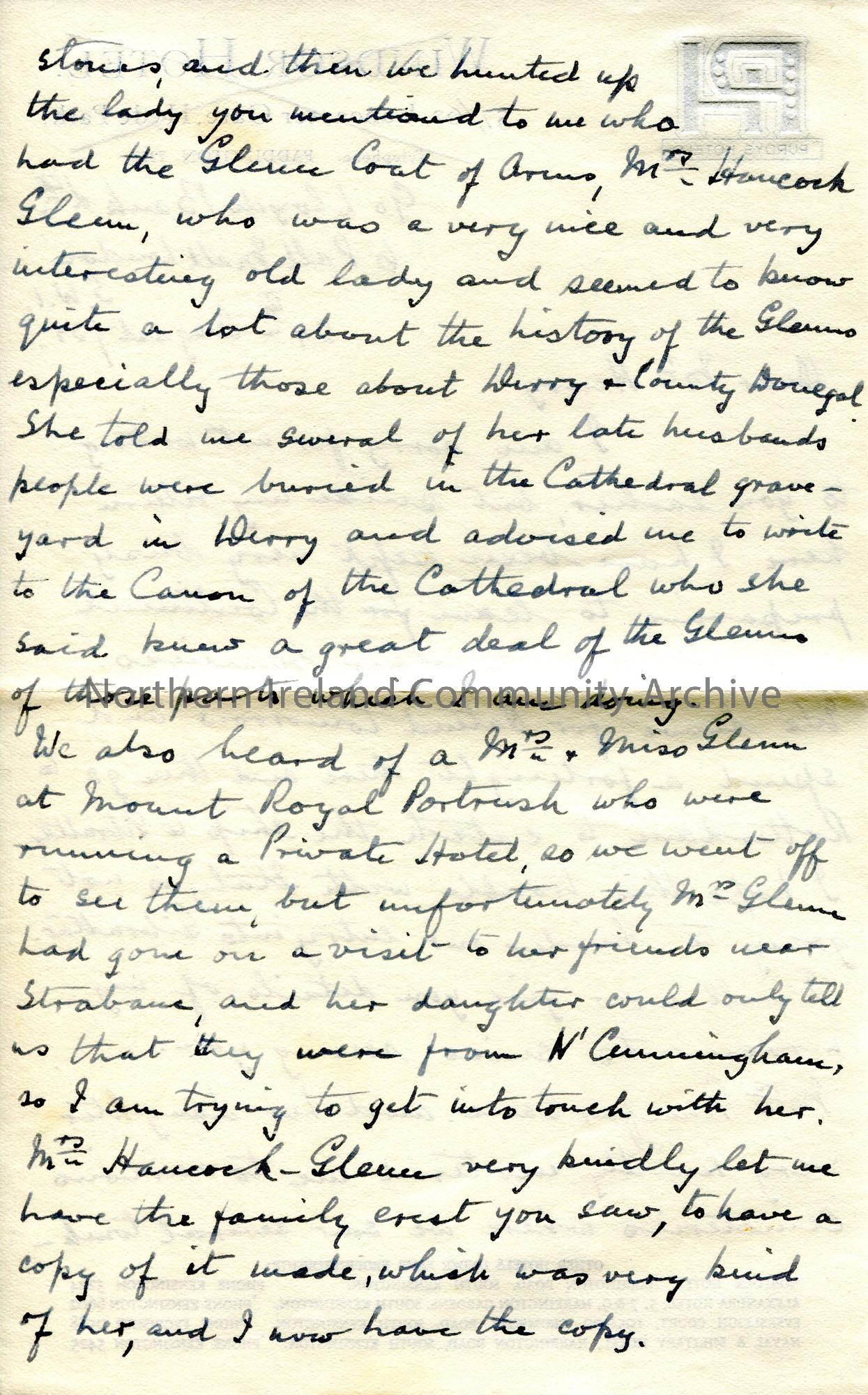 Page 1 of 2. Handwritten letter to Sam Henry from H Glenn. Updates Sam on his family history research re surname Glenn. – scan013b
