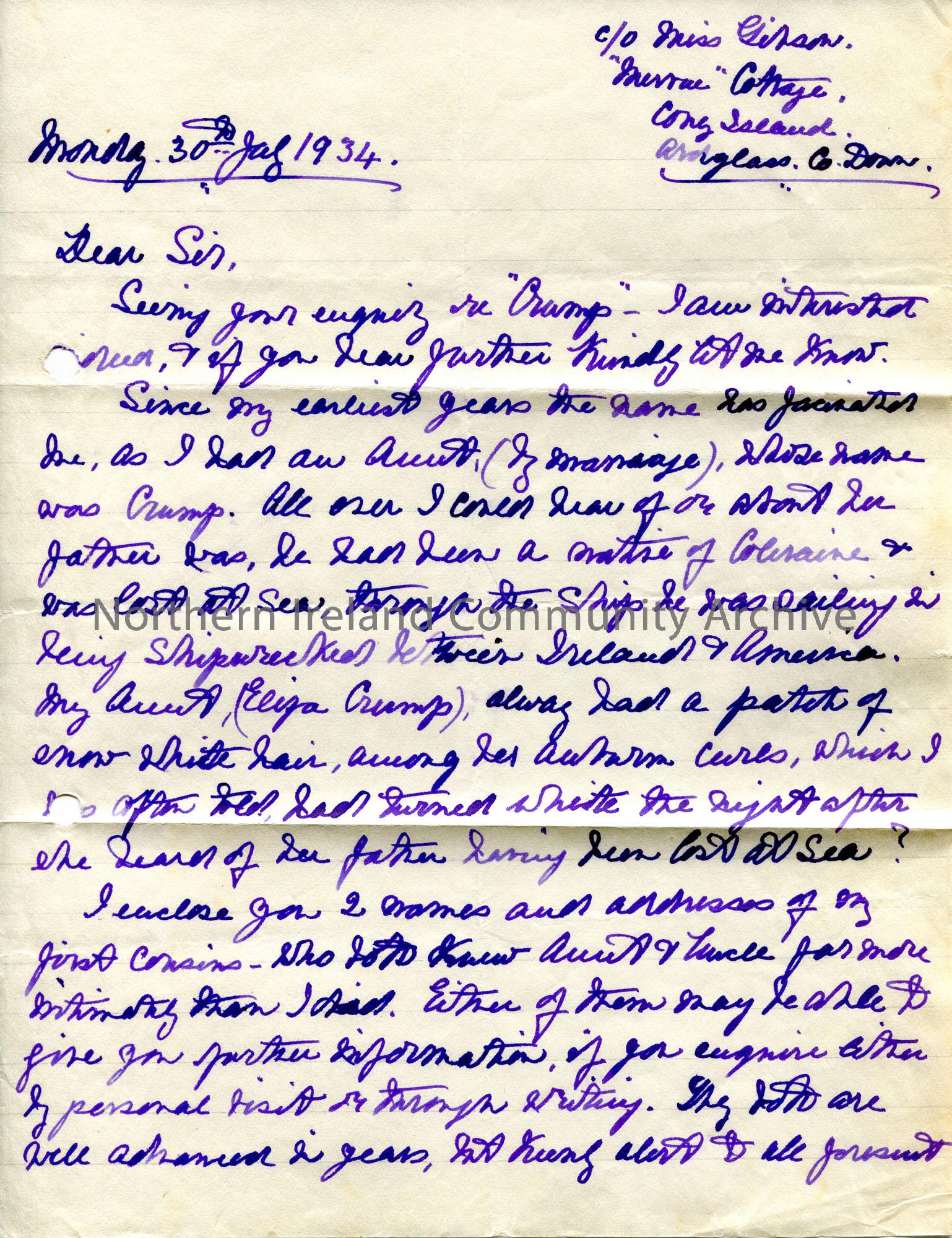 Page 1 of 2. Handwritten letter to Sam Henry from Lydia M McRobert. Responding to Sam’s enquiry re the name Crump.