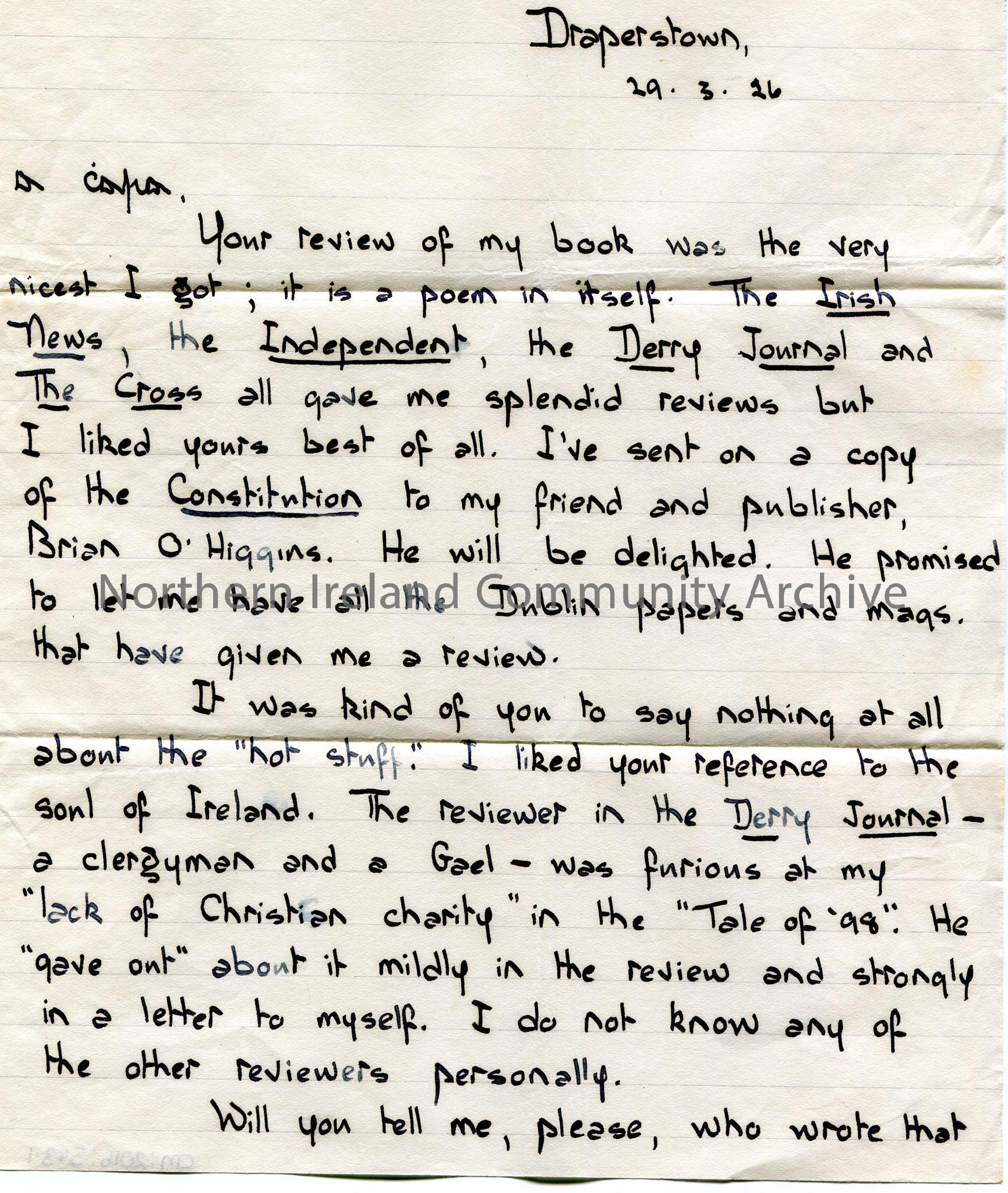 Page 1 of 2. Handwritten letter to Sam Henry from Nora Ni Cartáin Writing re review of her book. She preferred Sam's review best of all compared to the Irish News, the Irish Independent, the Derry Journal and the Cross, who all gave 'splendid reviews'. Has sent a copy of the Constitution to her publisher, Brian O'Higgins. Mentions a negative review from a reviewer in the Derry Journal. Asks who wrote about daffodils lighting up the grass. Asks Sam if he is an admirer of Moira O'Neill and if he knows Ethna Catbery's "Four Winds of Eireann". Heard Sam on the wireless and especially enjoyed the tin whistle. Refers to Joe Kelly who promises to take down some 'Screen airs for you.