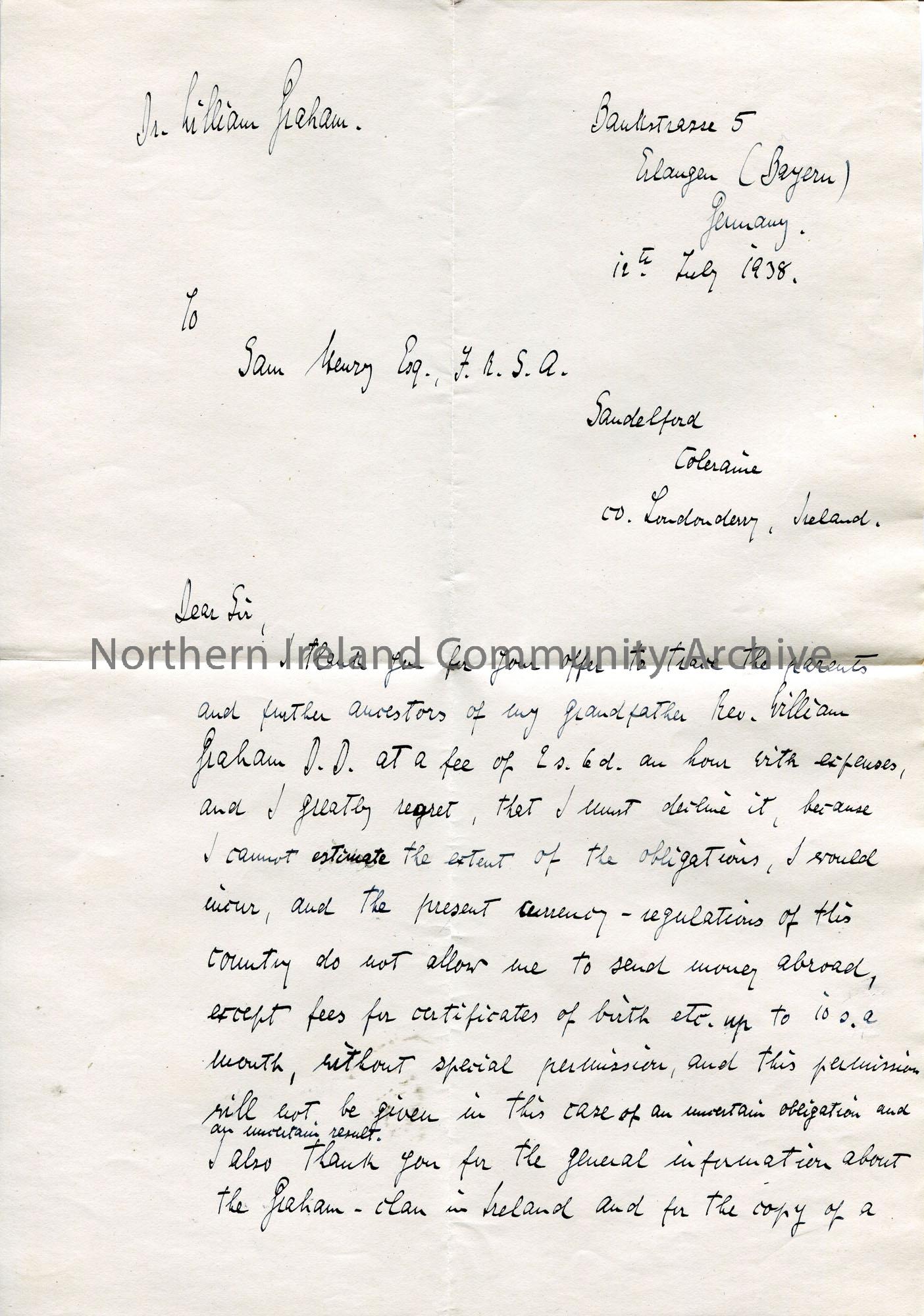 Page 1 of 2. Handwritten letter to Sam Henry from William Graham. Declines Sam's offer of genealogy research of the ancestors of his grandfather, Rev. William Graham D.D. due to the expense and current currency regulations in Germany. Thanks Sam for sending general information re Graham clan in Ireland. He requires documentary evidence of his Chrisitan ancestry to satisfy the German authorities.