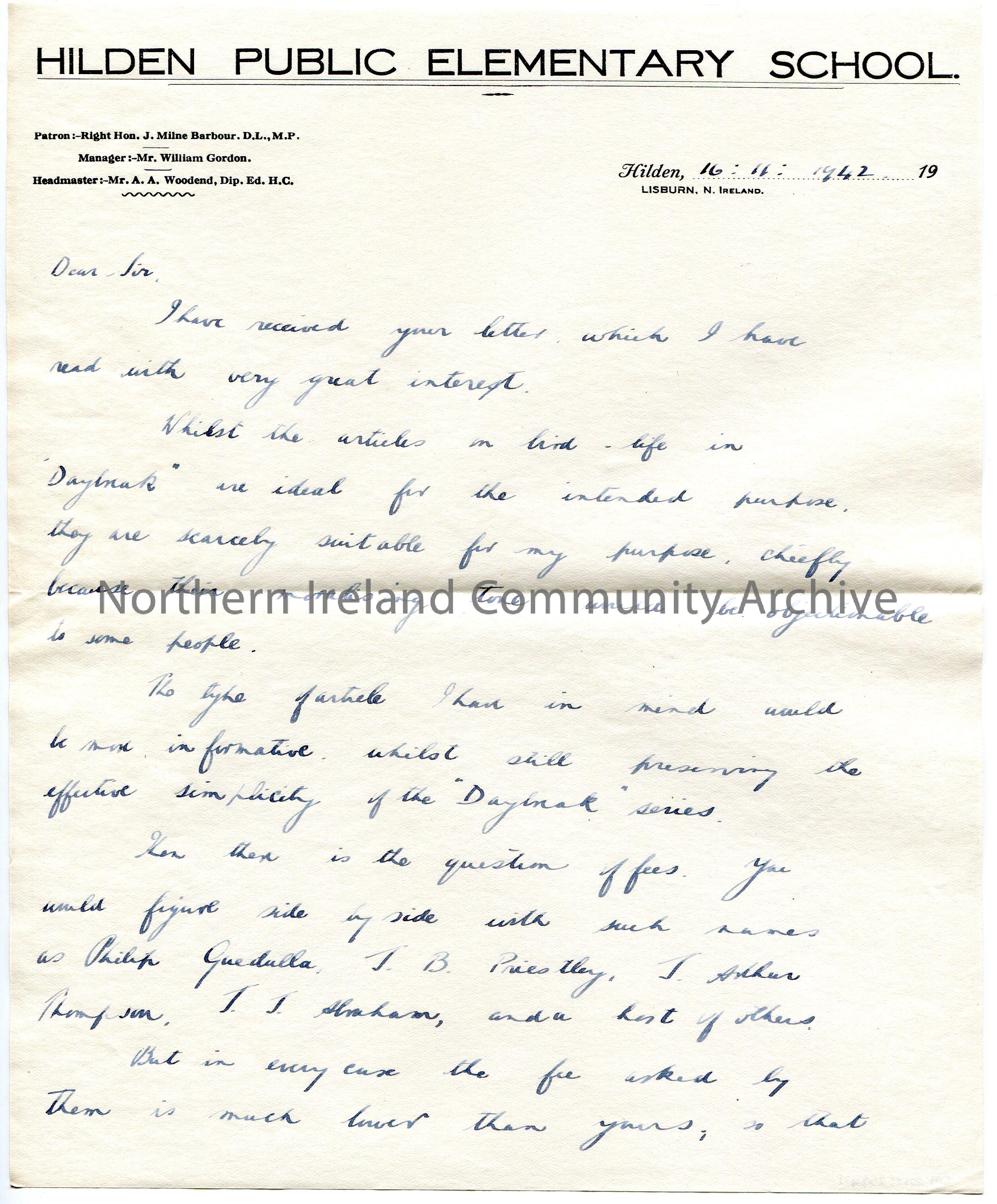 Page 1 of 2. Handwritten letter to Sam Henry. Rejects the articles Sam has written on Ulster birds for a 'Daybreak' series due to their 'moralising tone'. He also tells Sam that his fees are too high, compared to others fees such as J J Abraham. Suggests Sam charges £5 and loans the blocks for free. Notes that he was taught at Coleraine Model School.