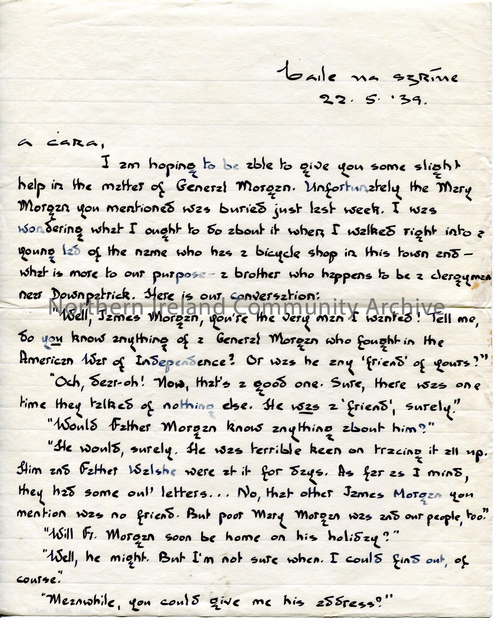 Page 1 of 2. Handwritten letter to Sam Henry. Responding to Sam’s query re General Morgan. Recommends Sam write to Rev. Peter Morgan, Downpatrick. [Se…
