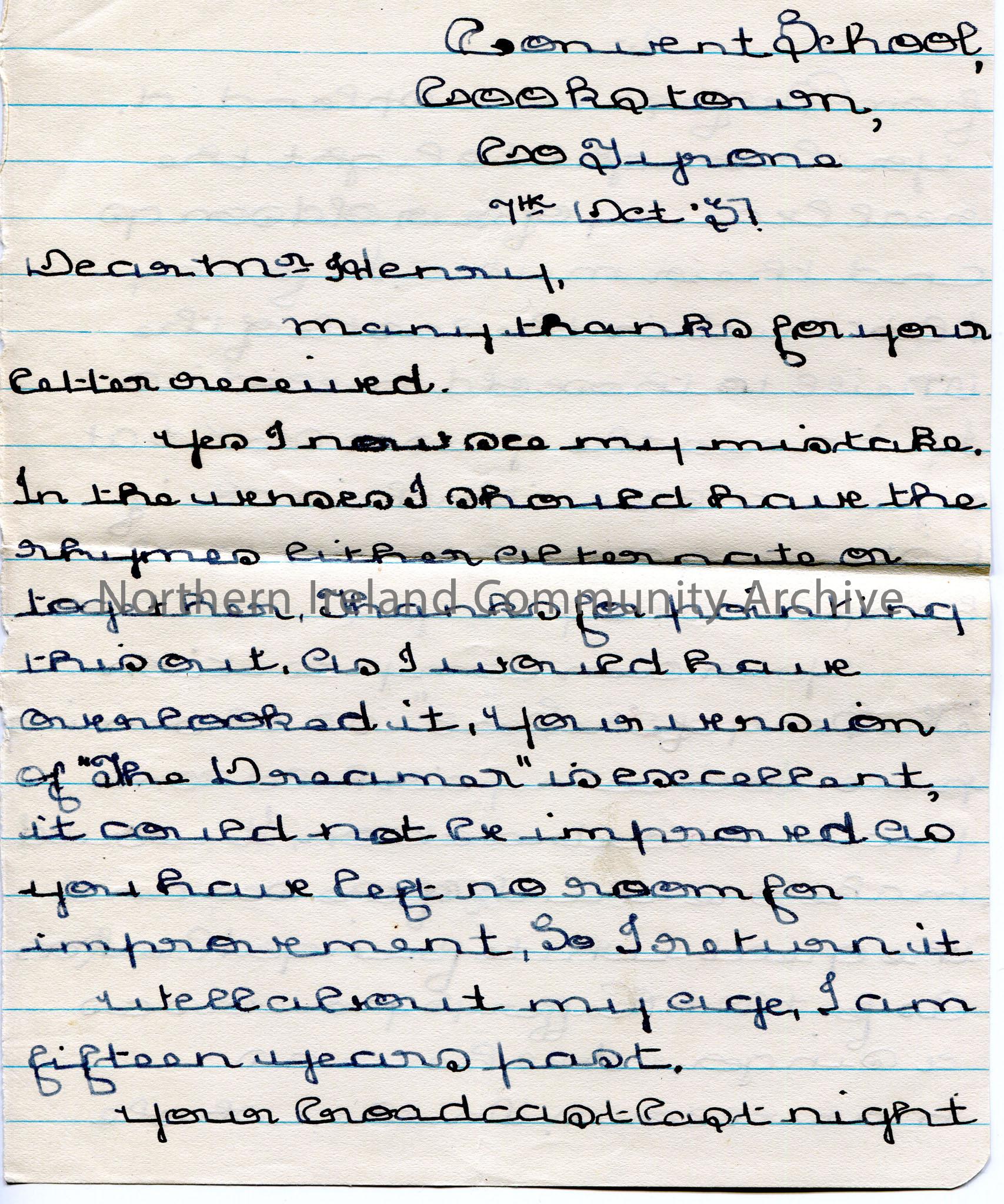 Page 1 of 2. Handwritten letter to Sam Henry. Thanks Sam for making corrections of their version of a song. Praises Sam's version of the song 'The December.' Writes re the broadcast on 6th October from Belfast.