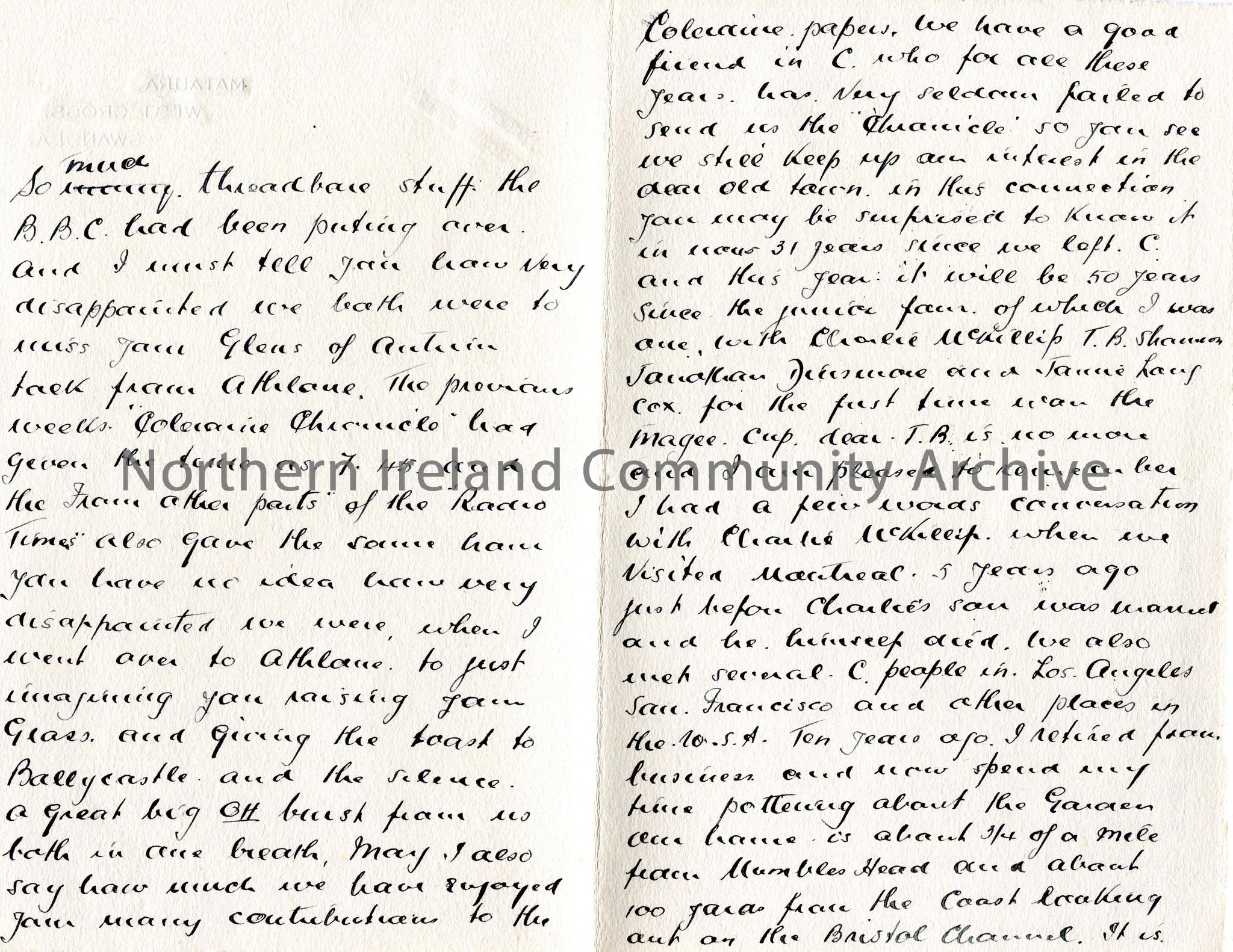 Page 1 of 2. Handwritten letter to Sam Henry. Writing re broadcast by Sam re Percy French. Disappointed to have missed Sam's talk on the Glens of Antrim from Athlone. Likes to keep an interest in Coleraine by reading the 'Chronicle' now and again which is sent to them. Mentions the Magee Cup. Reminisces about people he has met and places he has been. Writes of ships damaged during the war held in the dry dock. Mentions a solicitor Tom Taggart of Ballymoney who sang 'The Place where the Old Ass died'. They still have the photo of their children in the donkey cart which Sam took.