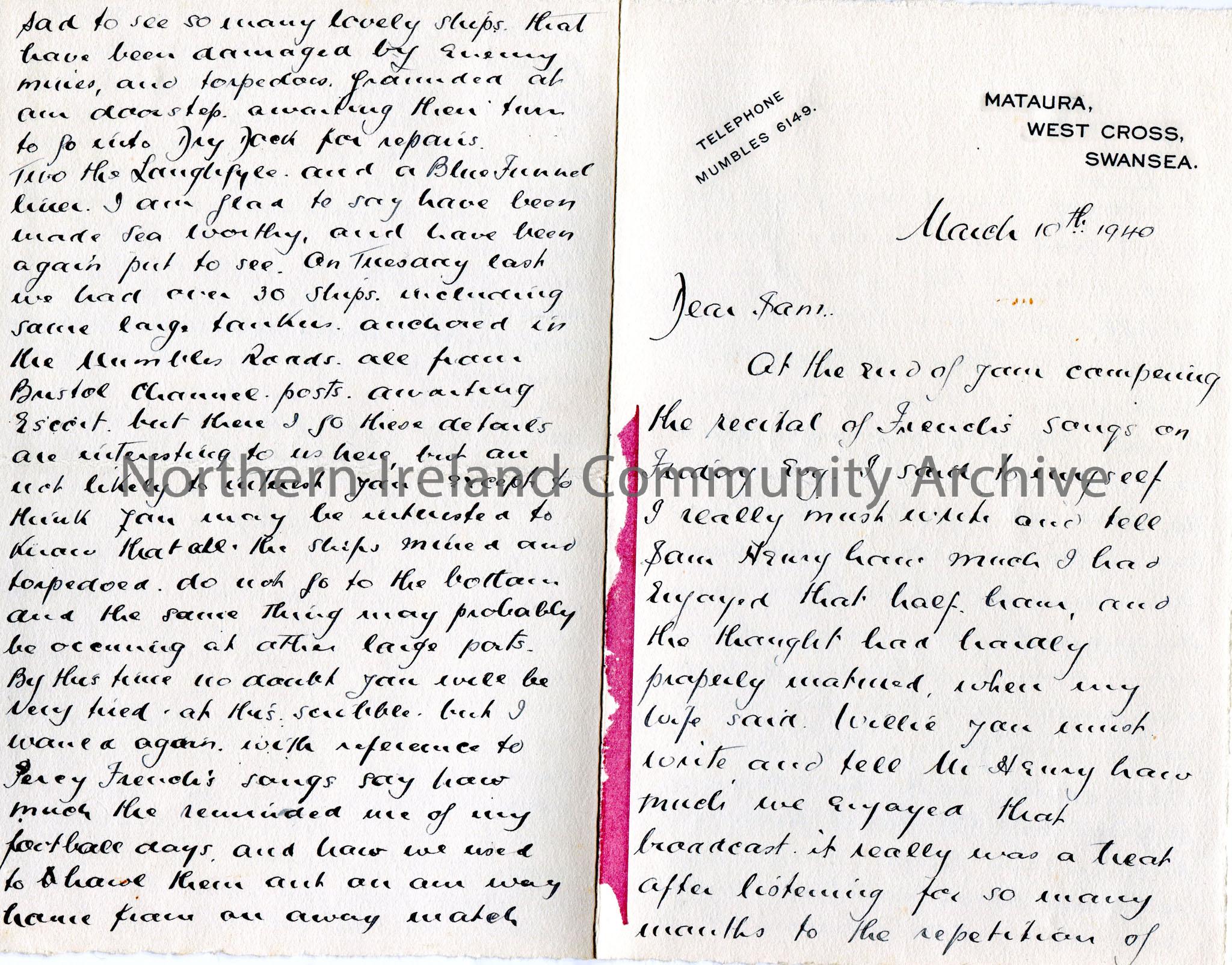 Page 1 of 2. Handwritten letter to Sam Henry. Writing re broadcast by Sam re Percy French. Disappointed to have missed Sam's talk on the Glens of Antrim from Athlone. Likes to keep an interest in Coleraine by reading the 'Chronicle' now and again which is sent to them. Mentions the Magee Cup. Reminisces about people he has met and places he has been. Writes of ships damaged during the war held in the dry dock. Mentions a solicitor Tom Taggart of Ballymoney who sang 'The Place where the Old Ass died'. They still have the photo of their children in the donkey cart which Sam took.