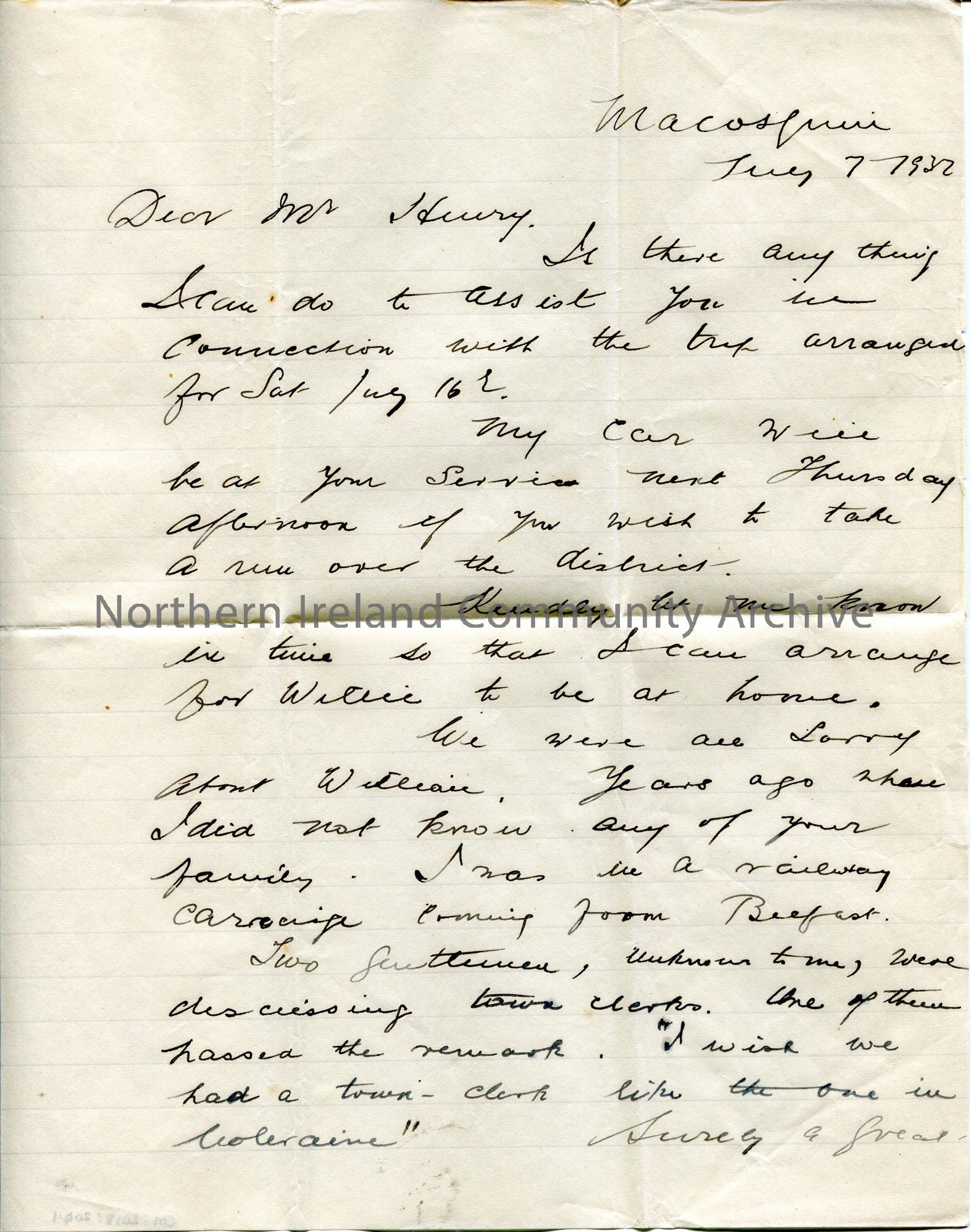 Page 1 of 2. Handwritten letter to Sam Henry. Writing re the death of Sam's brother, William, Town Clerk of Coleraine. Also writes of arrangements for a trip on 16th July 1932. Mentions having to provide refreshments for 80-100 Orangemen during the holidays.