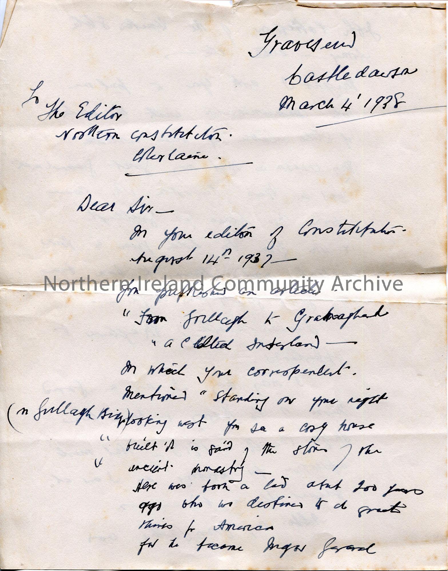 Page 1 of 2. Handwritten letter to the Editor of the Northern Constitution. [Handwriting is largely illegible]. Writing re an article published in the…