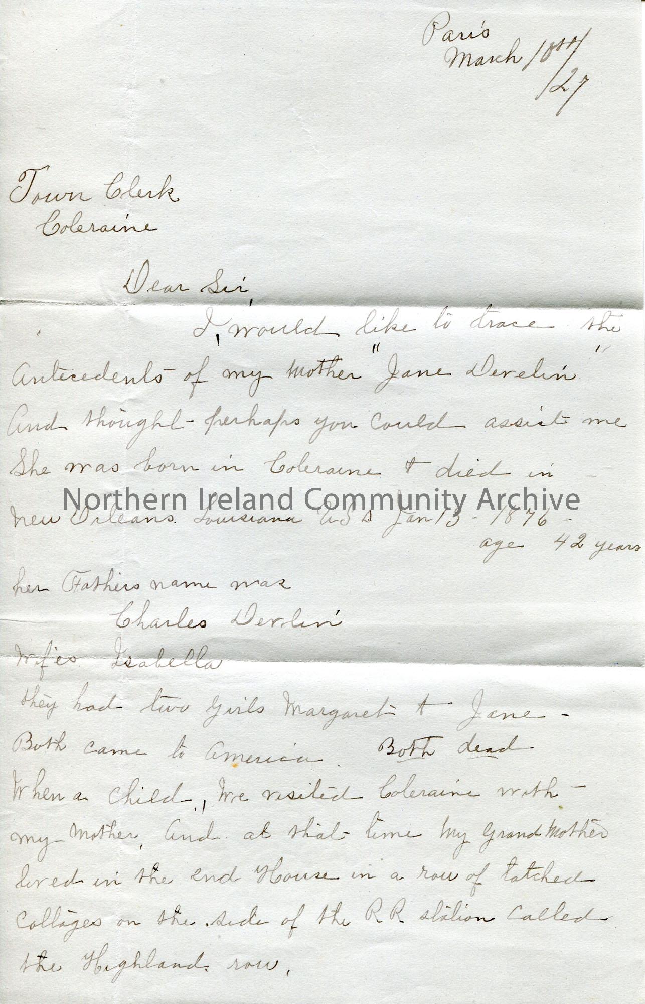 Page 1 of 2. Handwritten letter to the Town Clerk, Coleraine. Re family history research request. This is a letter which Sam found among his papers. Asks for help in tracing the antecedents of her mother Jane Develin from Coleraine who died in America 1876. Family lived in Highland Row, Coleraine.