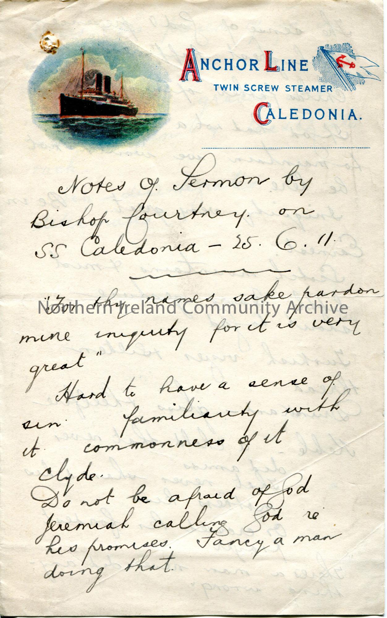 Page 1 of 2. Handwritten notes (folded and written on both sides) on 'Anchor Line Twin Screw Steamer Caledonia' headed paper. Titled, 'Notes of Sermon by Bishop Courtney on SS Caledonia - 25.6.11'.