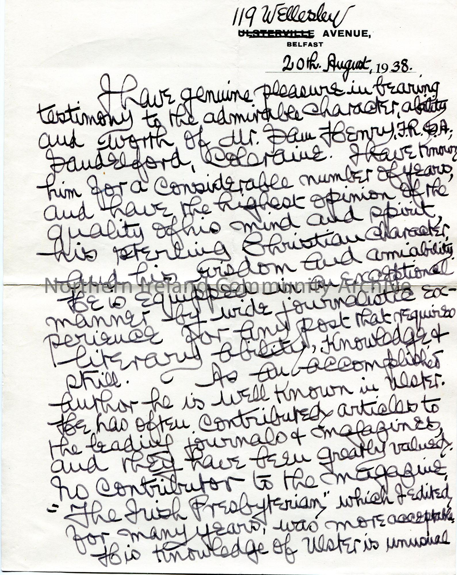 Page 1 of 2. Handwritten testimonial for Sam Henry re his application for post of Temporary Press Officer at the New Ulster House. Speaks highly of hi…
