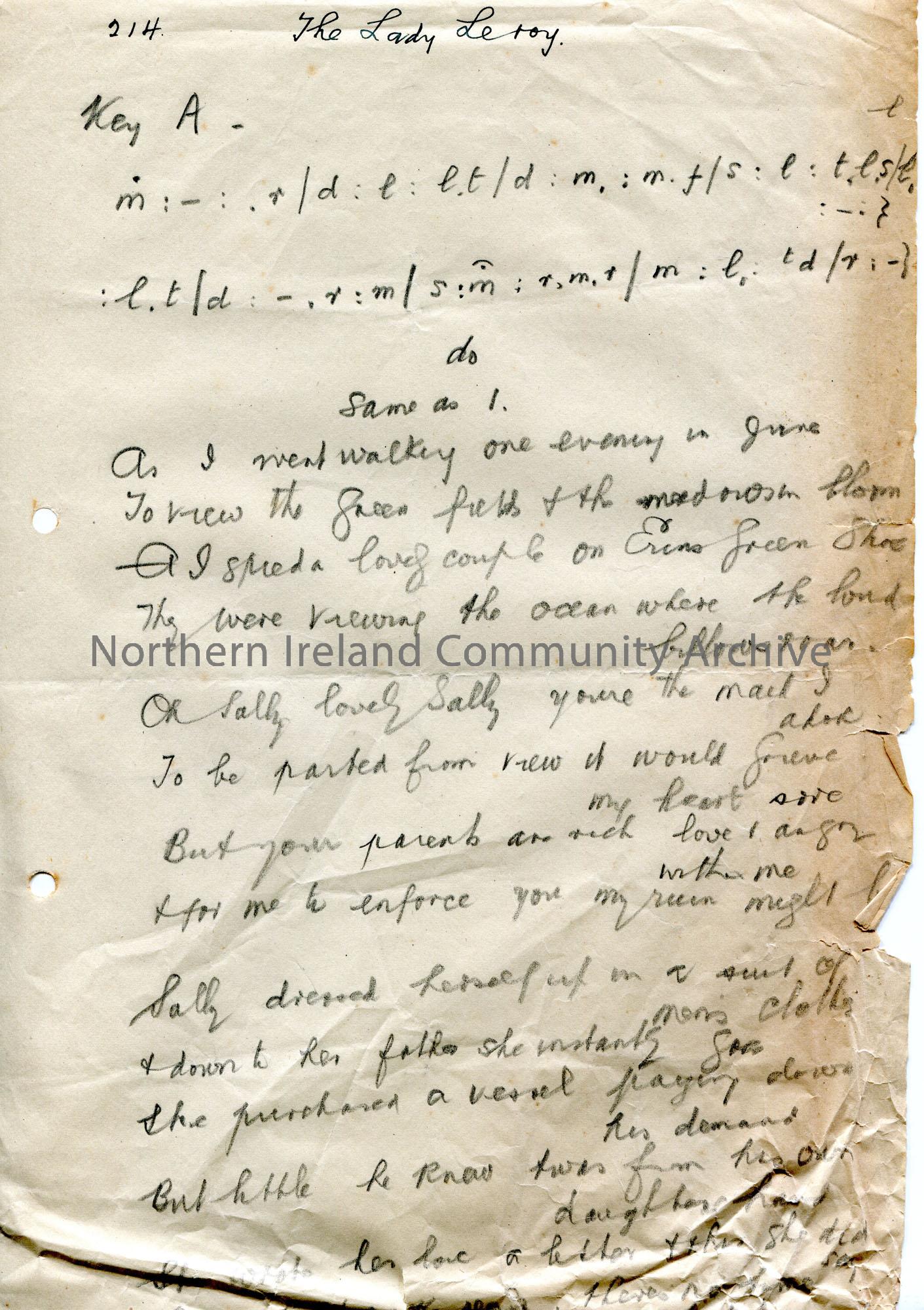 Page 1 of 2. Handwritten words in pencil to song titled, ‘The Lady Leroy’. Dated 24th December 1927. The song title is the name of the ship they saile…