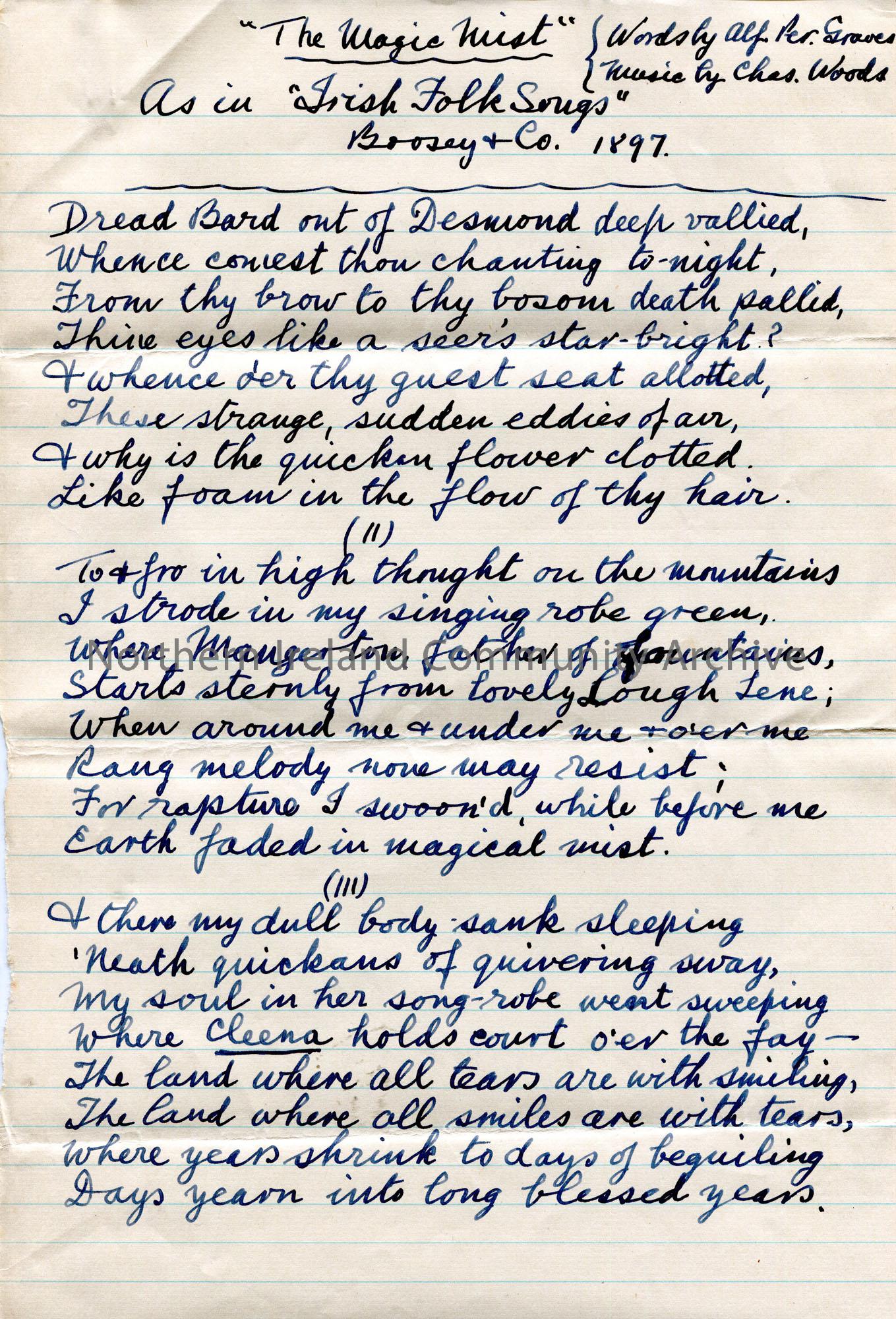 Page 1 of 2. Handwritten words to song ‘The Magic Mist’ as in ‘Irish Folk Songs’, Boosey & Co., 1897. Words by Alfred Graves and music by Chas. Woods….