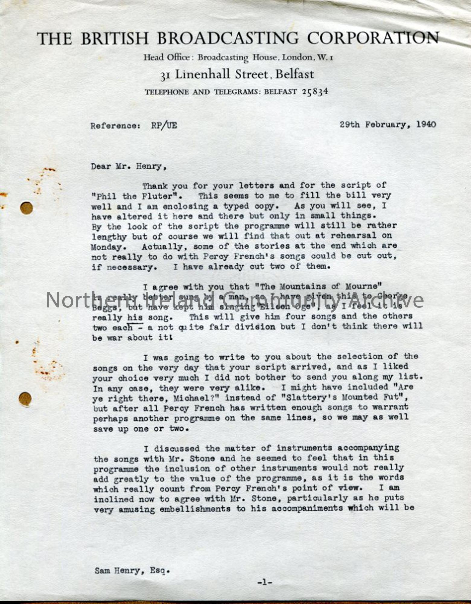 Page 1 of 2 typed pages of letter on BBC headed notepaper from Ursula Eason. Thanks for script and songs for 'Phil the Fluter' - cuts made to script, other arrangements for programme - about Percy French. Dated 29.2.1940.