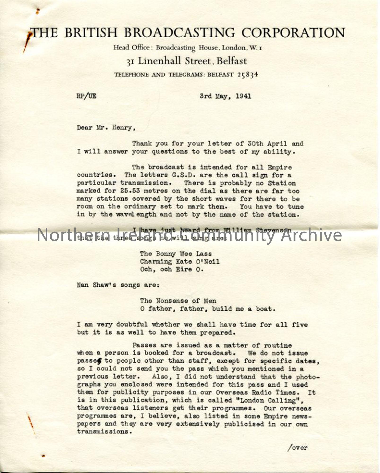 Page 1 of 2 – Letter from Ursula Eason of the BBC, dated 3.5.1941