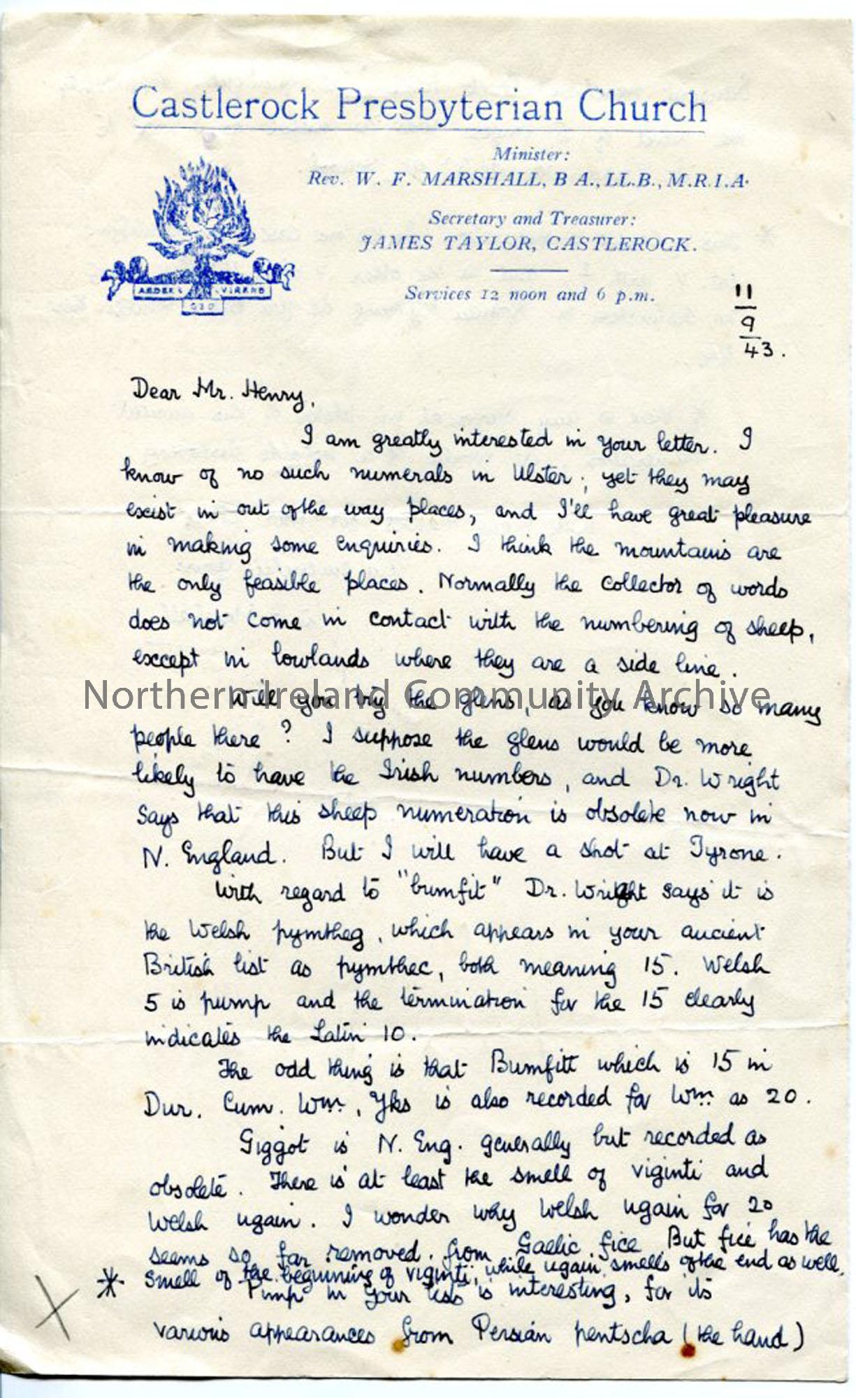 Page 1 of 2: Handwritten letter from W. F. Marshall on headed notepaper of Castlerock Presbyterian Church - relating to number terminology in sheep numbering, origin of numbers, links to Welsh language, possibility of ancient system of numbering sheep still being used. Dated 11.9.1943