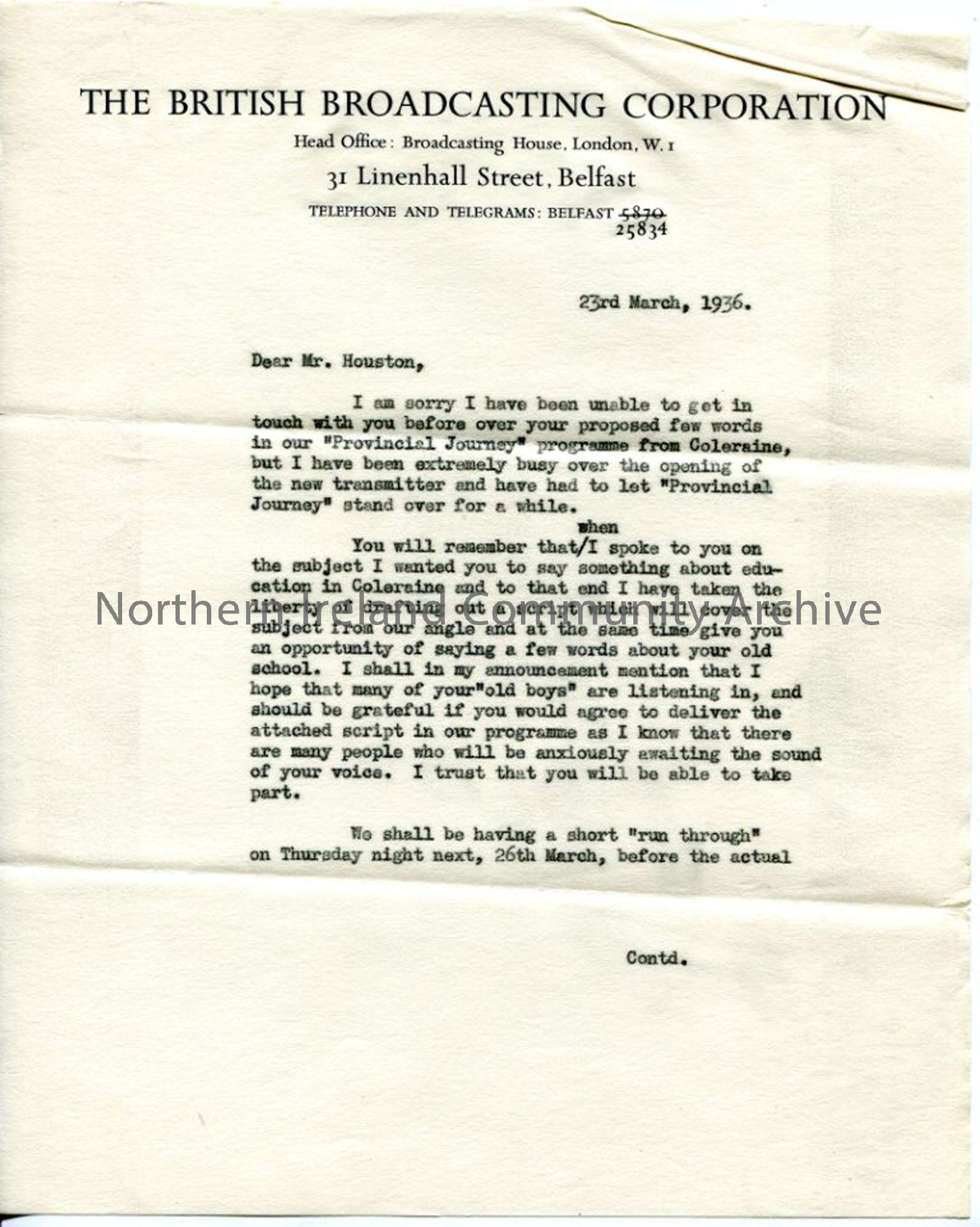 Page 1 of 2 : Letter to Mr T. G. Houston from the BBC, dated 23.3.1936