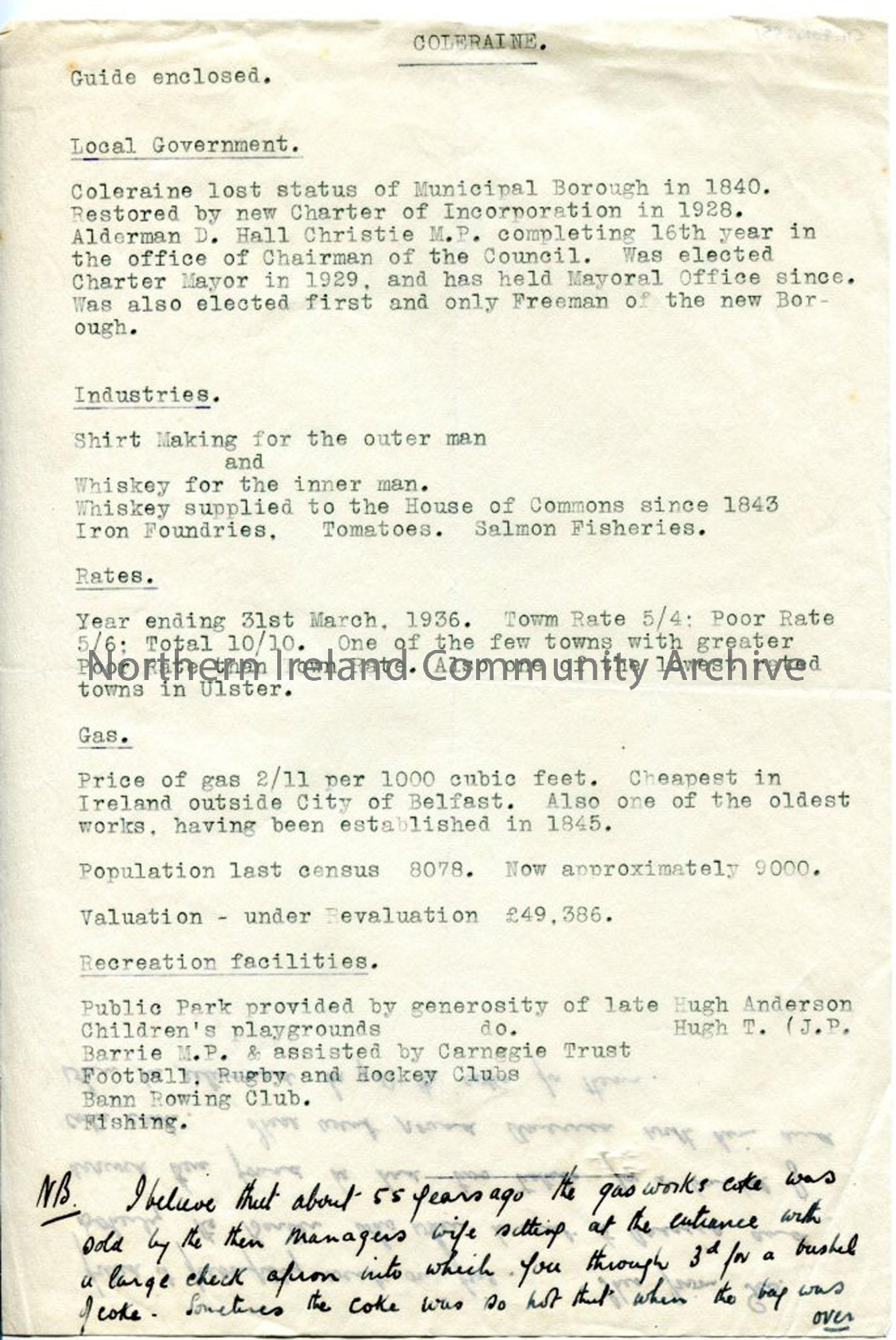 Page 1 of 2 - Typed notes relating to Coleraine - local government, industries, recreational facilities. Additional handwritten story about gas. Possible information for 'Provincial Journey' programme.