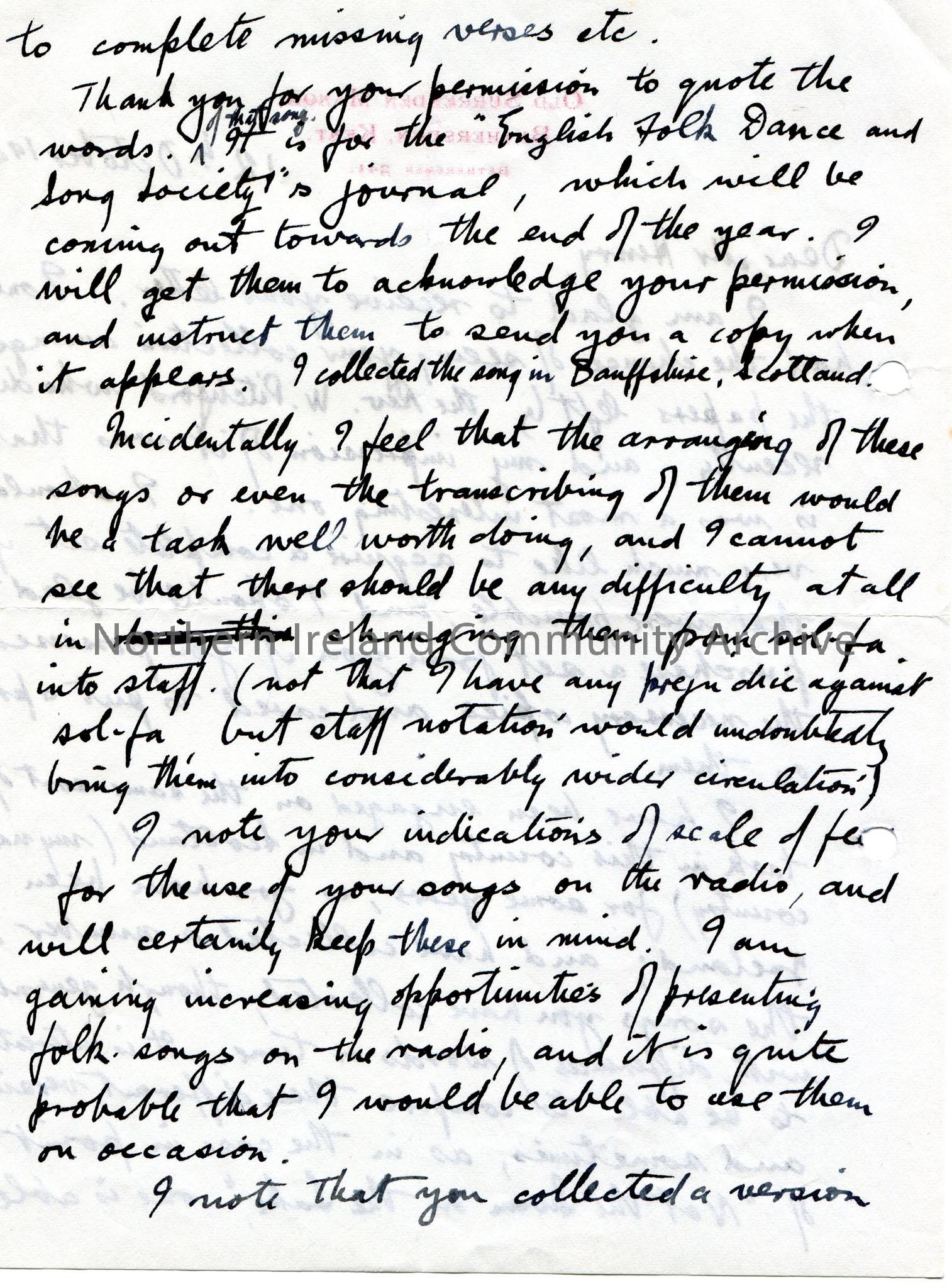 Page 1 of 2 of a handwritten letter (double sided) to Mr Henry. Writes of seeing Sam's collection amongst papers left by the late Rev. W Pitchford. He would be happy to purchase copies from the collection. He too collects songs and does so in England and his native area of Scotland. Collects similar songs to Sam but mostly with different words and tunes. Sam has given permission for a song to be published in the 'English Folk Dance and Song Society' journal. Talks of changing the songs from sol-fa notation to staff notation. He presents folk songs on the radio and will bear Sam's fees for use of his songs in mind if using them. Mentions folk songs 'Not the Swan on the Lake' and 'The Blackbird'.