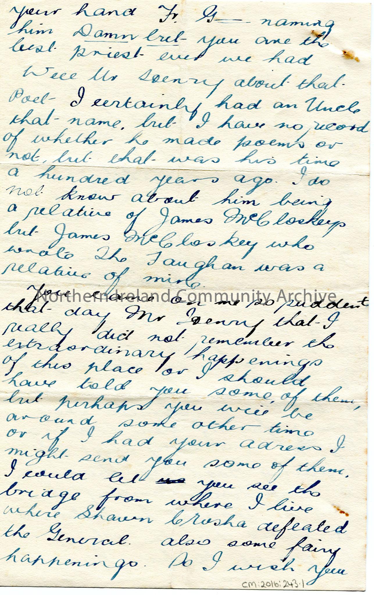 Page 1 of 2 of a handwritten letter from Jack Lynch to Sam Henry praising him and Mr Irwin for a broadcast in Dublin. Reference to James McCloskey. – img021b
