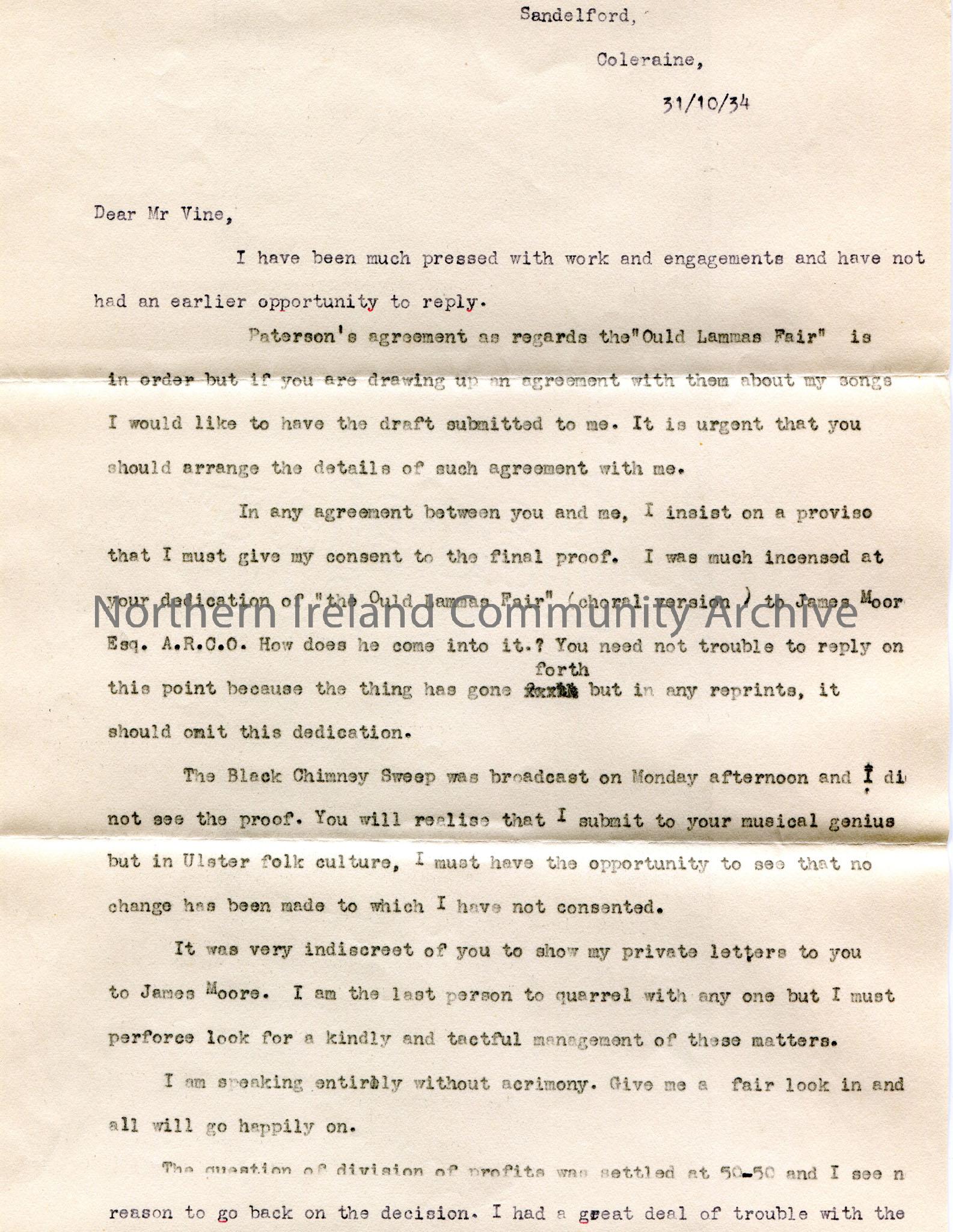 Page 1 of 2 of copy of a typed letter to Mr Vine. Sam writes, in a frank tone of his displeasure of the actions of John Vine. Sam appears unhappy that Vine has not let Sam approve of agreements for use of songs the 'Ould Lammas Fair' and 'The Black Chimney Sweep' as well as the showing of Sam's private letters to James Moore by John Vine.
