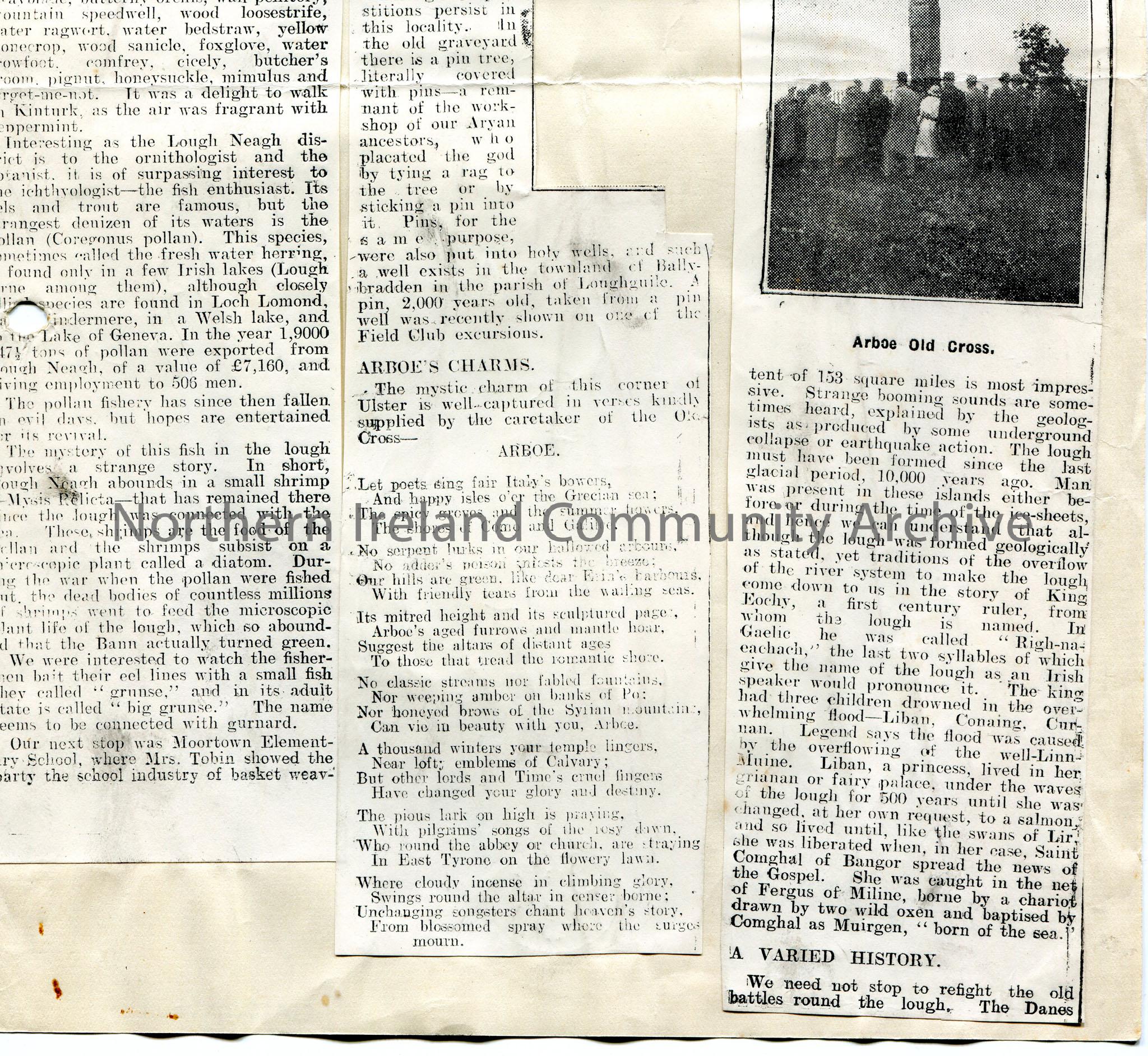Page 1 of 2 of cut out article from a publication and stuck to paper. Article re a day trip by the Coleraine Club to see the birds, flowers and fish at Kinturk and Lough Neagh area, the Cross of Arboe, Ardtrea and Desertcreat. Includes four images, three of which are captioned, 'Arboe Old Cross', 'Salter's Castle' and 'Newport Trench Harbour'.