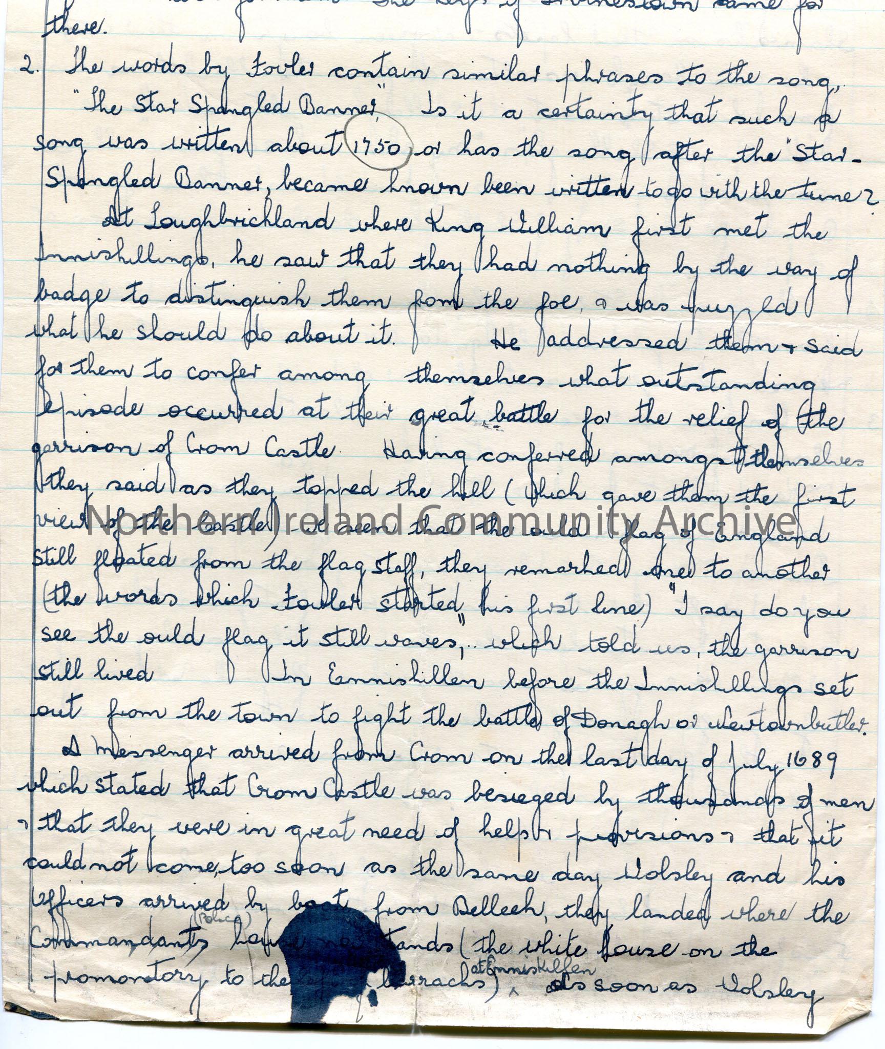 Page 1 of 2 of handwritten answers (double sided) to questions on the possible connection between the song ‘The Star Spangled Banner’ and Royal Innisk… – scan409b