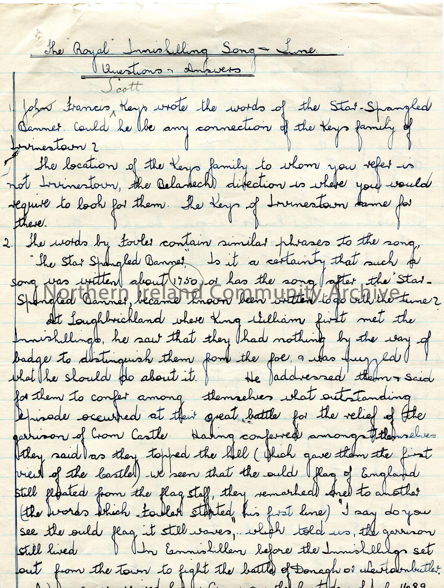 Page 1 of 2 of handwritten answers (double sided) to questions on the possible connection between the song 'The Star Spangled Banner' and Royal Inniskillings. Page titled, 'The Royal Inniskilling Song - Tune. Questions and Answers'.