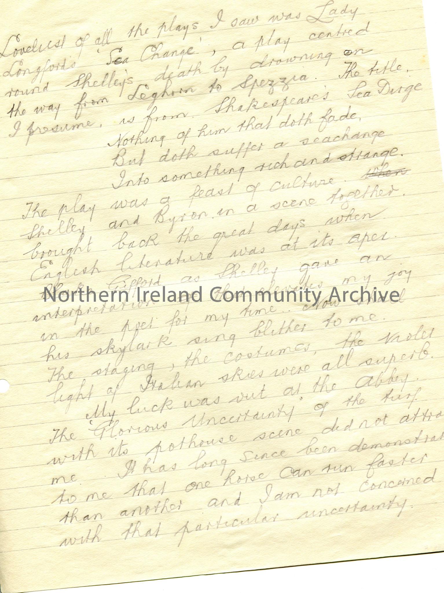 Page 1 of 2 of handwritten (in pencil) review of Lady Longford’s play titled, ‘Sea Change’.