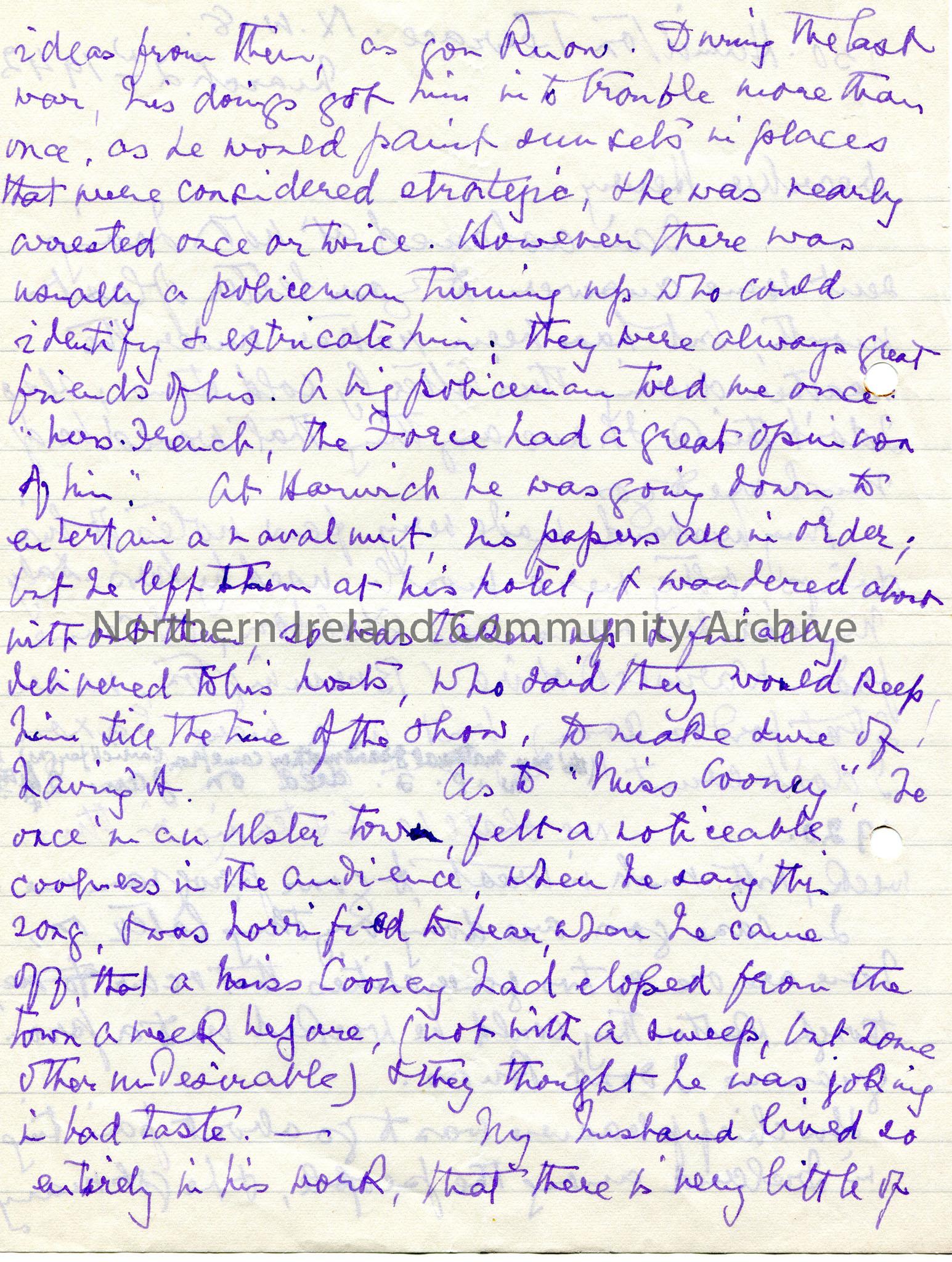 Page 1 of 2 of handwritten letter (double sided) in purple ink to Mr Henry. Ashamed for late reply. Writes that her maiden name was Sheldon, came from Warwickshire and her maternal grandmother was from Carrickfergus. Writes that during WWI Percy would get into trouble as he would 'paint sunsets in places that were considered strategic'. However, the police had a high opinion of him. She writes that he spent a lot of his time painting when not entertaining and would often try to avoid social situations. He lacked ambition but did his work well. He wanted to live life without worry and 'said himself that he had never grown up'. Mrs French believes this makes it difficult for her to find 'episodes' for Sam.
