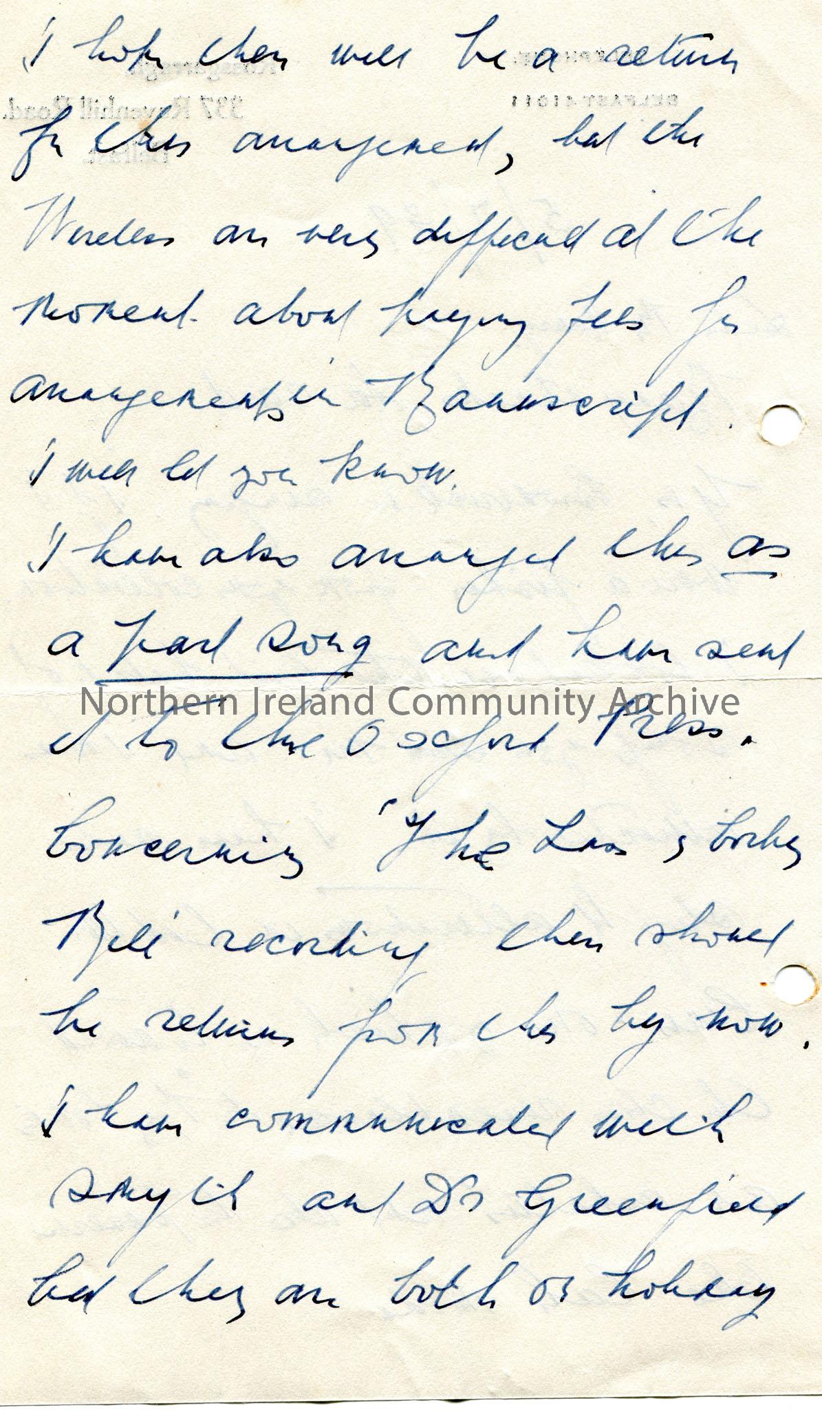 Page 1 of 2 of handwritten letter (double sided) to Mr Henry. Writing re arrangement of songs. Mentions the Oxford Press. – scan009b