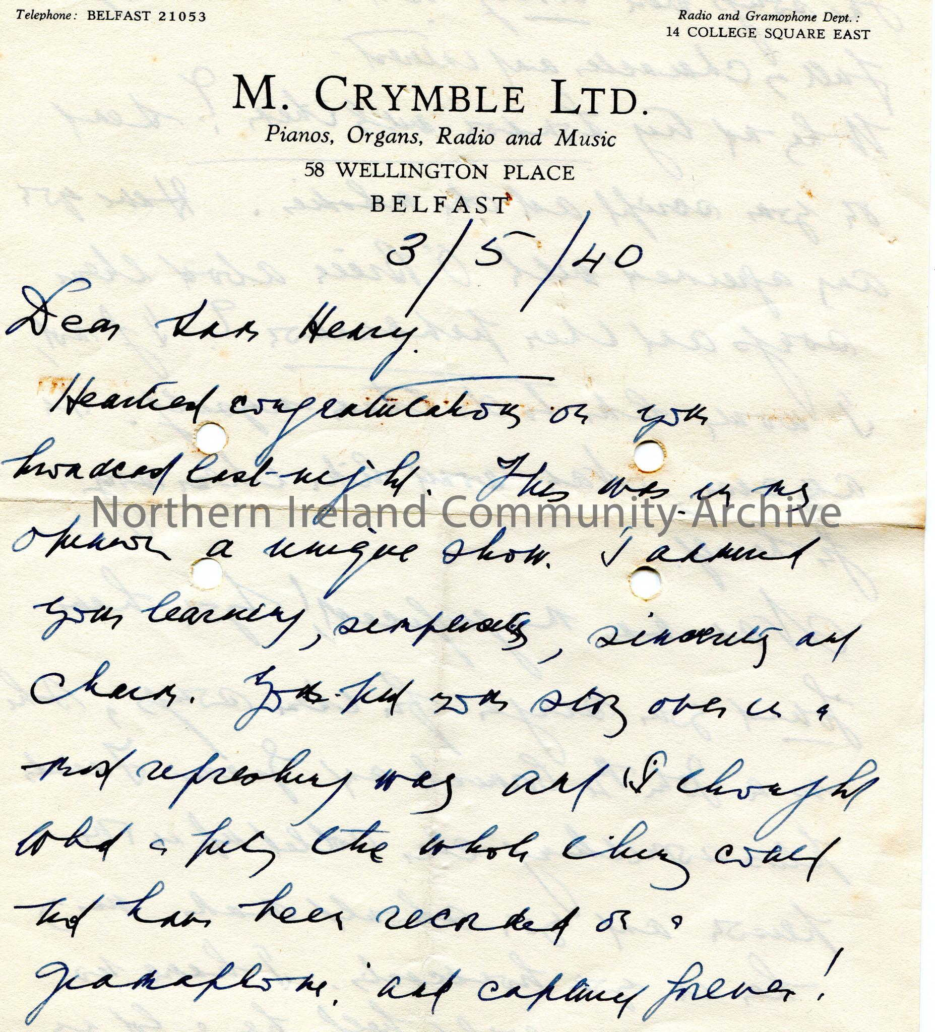 Page 1 of 2 of handwritten letter (double sided) to Sam Henry. Congratulates Sam on his broadcast last night. Asks Sam to send a script and melodies. Writes that Nan [Shaw] was magnificent and that Sam has found his singer for the songs. Would be pleased to do arrangements for songs.