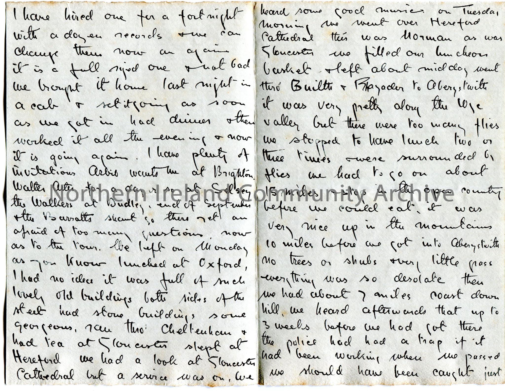 Page 1 of 2 of handwritten letter from A. Marshall Arter (Dorothy's brother Bertie) to their mother. Writes of being in a tour in a car having covered 1103 miles. He is adamant that his mother remind people in Hampstead he has not been in Wales. He has hired a gramophone for 2 weeks and a dozen records. He has had several invitations - Arbil has invited him to Brighton; Walter Arter for a day at Selsey; the Walkers at Dudley and from the Barratts. Gives an account of his tour through parts of England and Wales. Went to Miss Hodges wedding and returned via Hatfield the next day. Asks after his father.