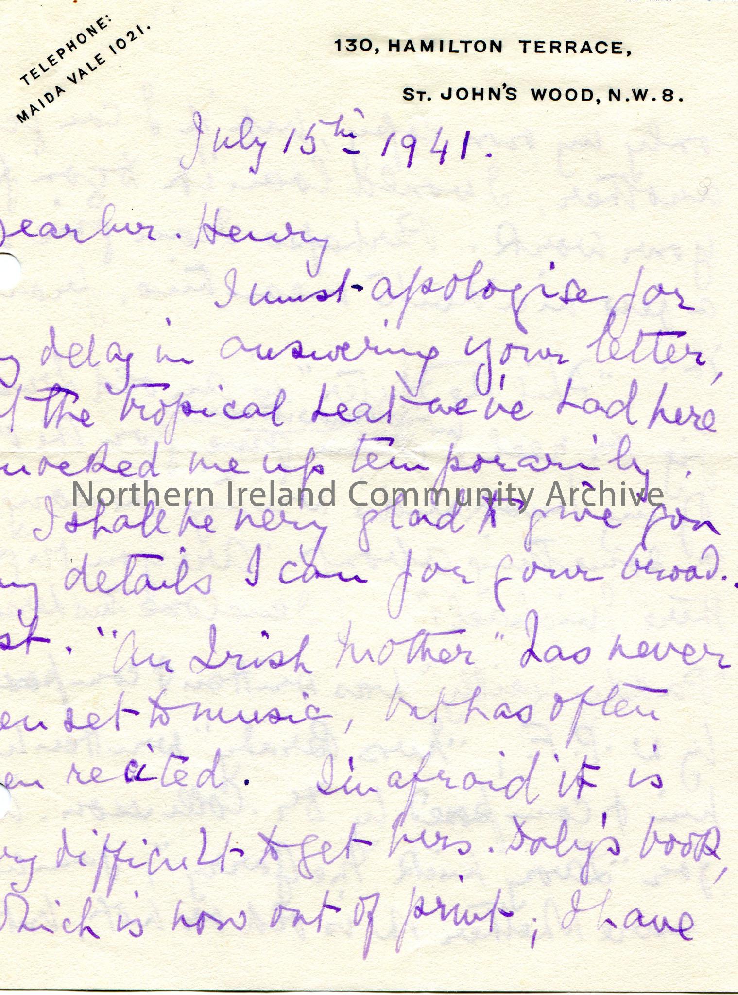 Page 1 of 2 of handwritten letter (page 1 double sided) to Mr Henry. Apologises for delay in replying to Sam's letter. Writing re Percy French and his songs for material for Sam's broadcast. Refers to songs 'An Irish Mother', 'Phil the Fluter', and 'Paddy Reilly'. Encloses three pages of details information re Percy French songs - CM:2017:906.1-3.
