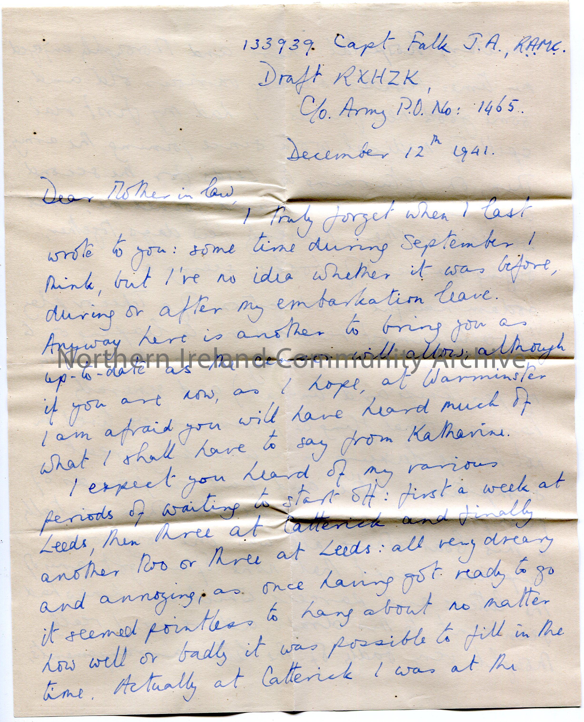 Page 1 of 2 of handwritten letter to 'Dear Mother in law' [Mrs R K Hezlet]. Writes of his medical training in Leeds and Catterick. Reminises of his time spent with Katherine whilst on leave. Complains of the postal service and mail not being received. He was pleased with the food they got on the boat. Mentions a child - Richard - who is learning to talk. He wonders how the 'Irish members of the family' are, particularly Arthur and notes he is 'impressed by his branch of the services'.