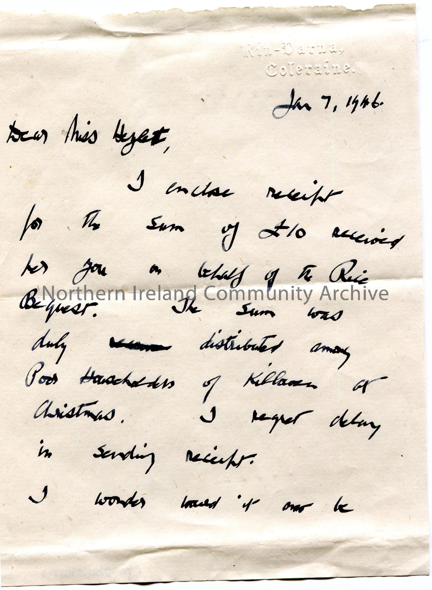 Page 1 of 2 of handwritten letter to Miss Hezlet. Encloses receipt for £10 on behalf of the Rice? Bequest. The money was distributed among poor households of Killowen at Christmas. Requesting photograph of Miss Hezlet's great grandfather from The Bovagh Jug?