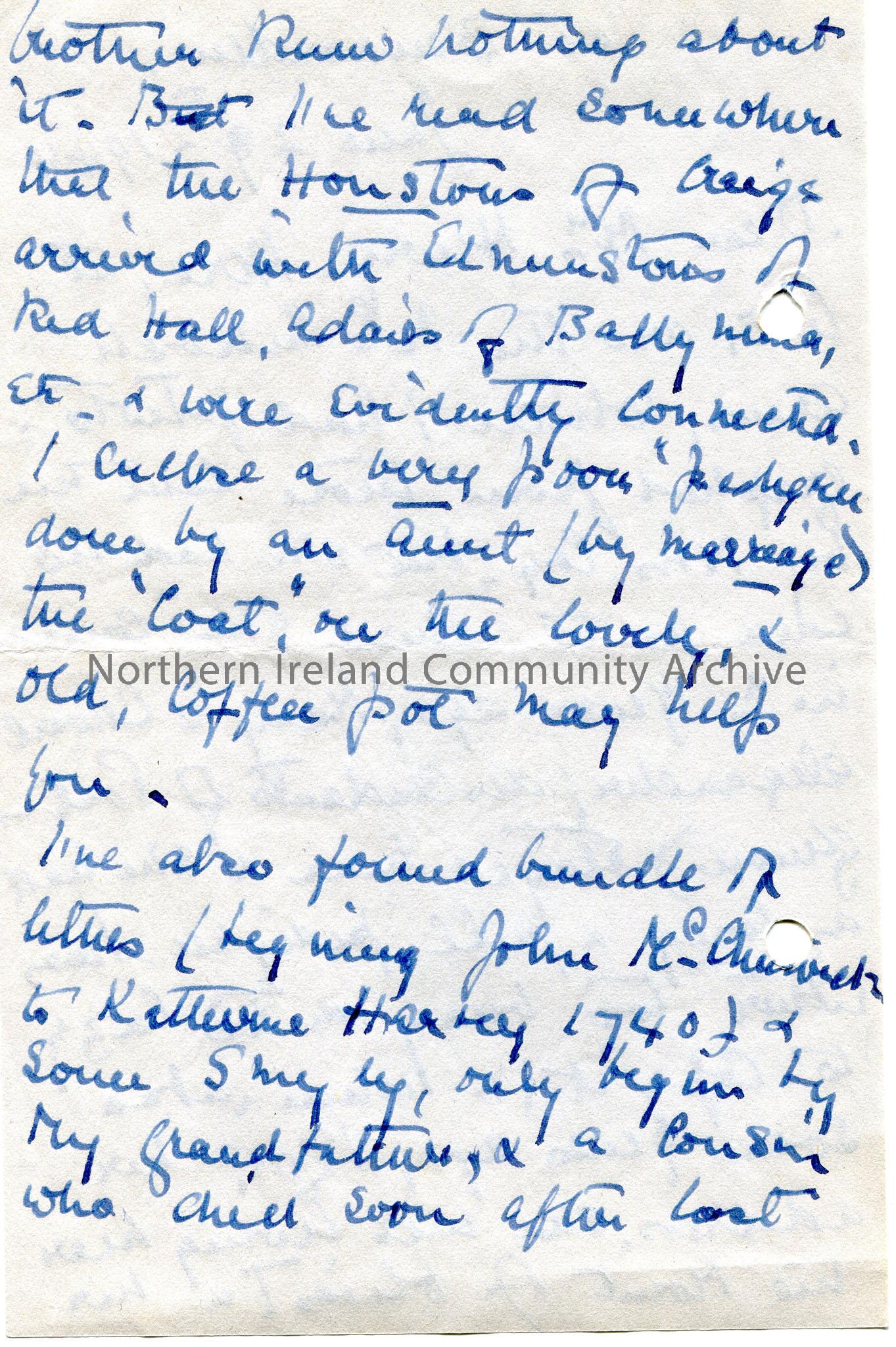 Page 1 of 2 of handwritten letter to Mr Henry. Photographed the McCulloch airs? which were lent to her by Miss Cox. Mentions Mary and Edward Alexander of Portglenone, Houstons of Craigs, Houstons of Red Hill, Adairs of Ballymena. Mentions letters she found and a cousin who died after the war [World War I]. Mentions the Constitution and an Adam Modenwell. Appears to be writing about ancestors. Suggests the formation of a Spring festival.