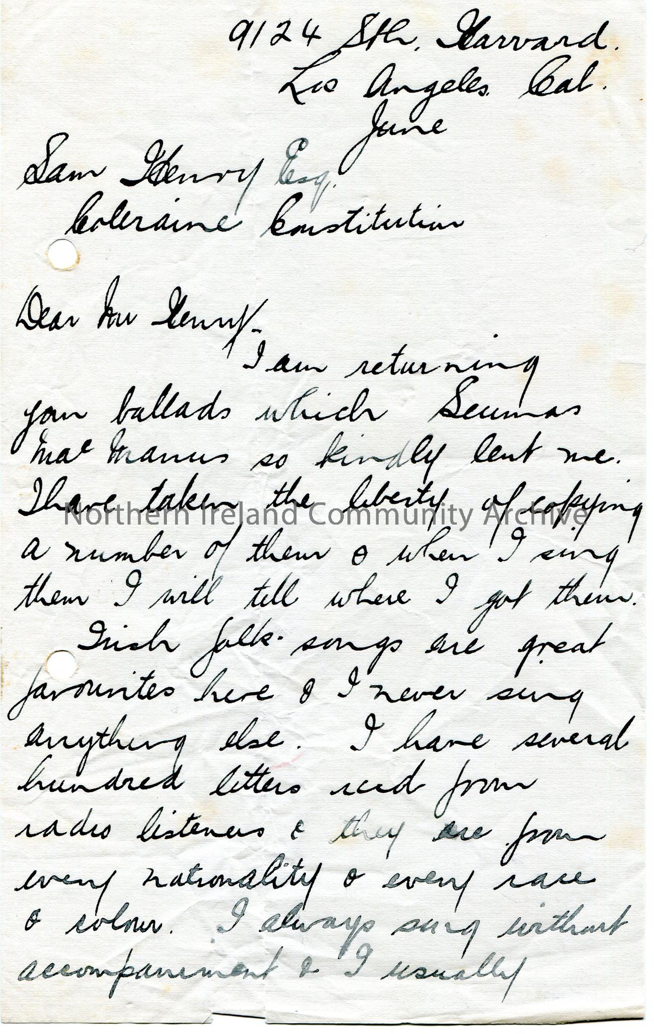 Page 1 of 2 of handwritten letter to Sam Henry, Coleraine Constitution. Returning ballads lent by Seumus McManus for singing. Writes of the popularity of Irish folk songs in America and sees no reason for them to die out.