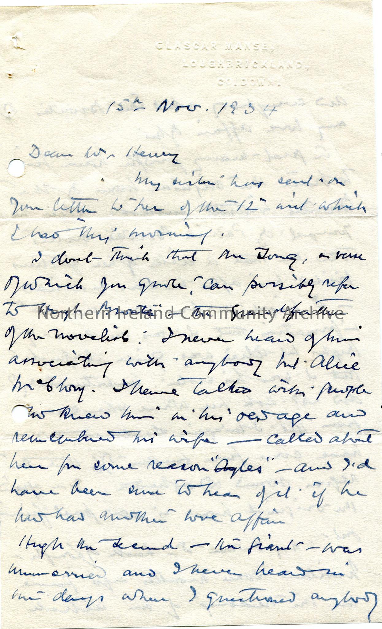 Page 1 of 2 of handwritten letter to Sam Henry, dated 15th November, 1934. Re a song, the name Bronte, the grandfather of the novelist and a love affair. Refers to reading an article of Sam's in one of the Coleraine papers which he says in well written and asks if it is available in another form.