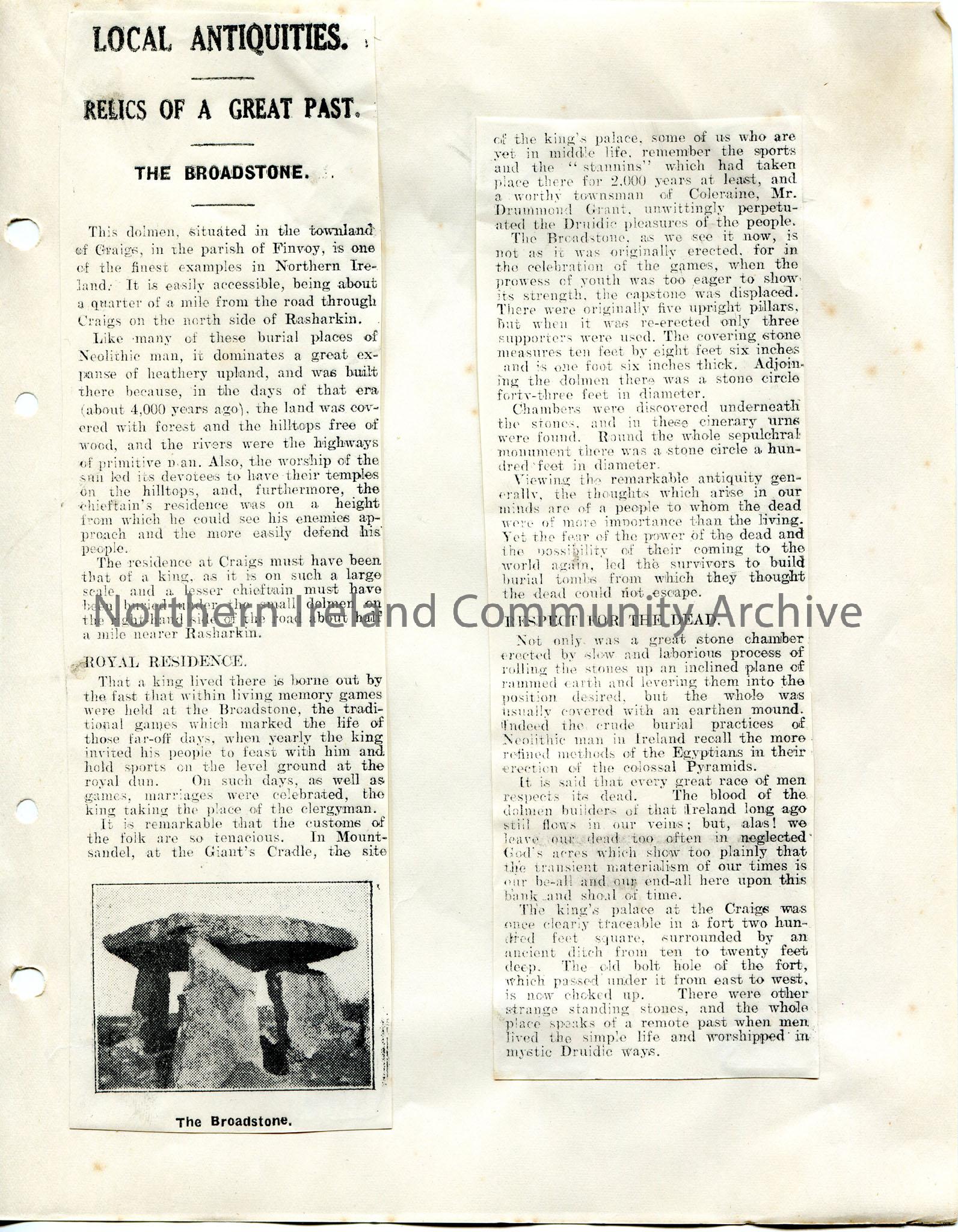 Page 1 of 2 of newspaper cutting of article titled, 'Local Antiquities. Relics of a Great Past. The Broadstone'. Refers to Craigs townland in the Parish of Finvoy, Rasharkin. Mentions Mountsandel, Coleraine. Also refers to Agivey Old Graveyard and the Cannings, Garvagh. Photographic image on page 1 captioned 'The Broadstone'. Two photographic images on page 2 - one is of a man standing beside a font captioned 'Old Font' and another captioned 'Bell-rope Stone'.