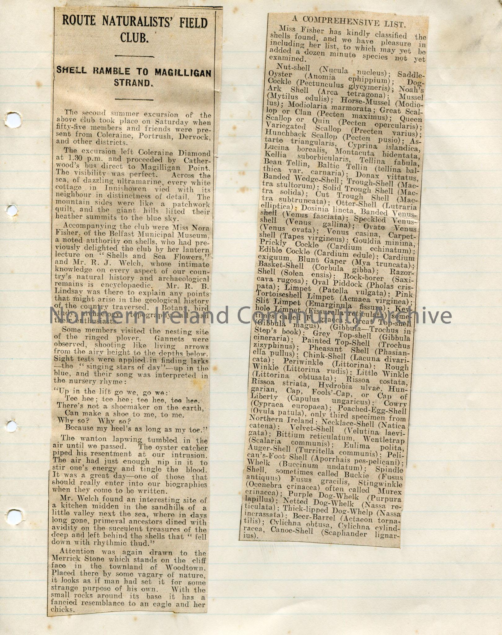 Page 1 of 2 of newspaper cuttings stuck to lined paper titled, 'Route Naturalists' Field Club. Shell Ramble to Magilligan Strand.' Re the second summer excursion of the club along with Miss Nora Fisher of Belfast Municipal Museum, Mr R. J . Welch and Mr R. B. Lindsay. Includes a list of shells found. Miss Watt, Portrush, president of the club while Rev John Watson, Ballyrashane as vice president.