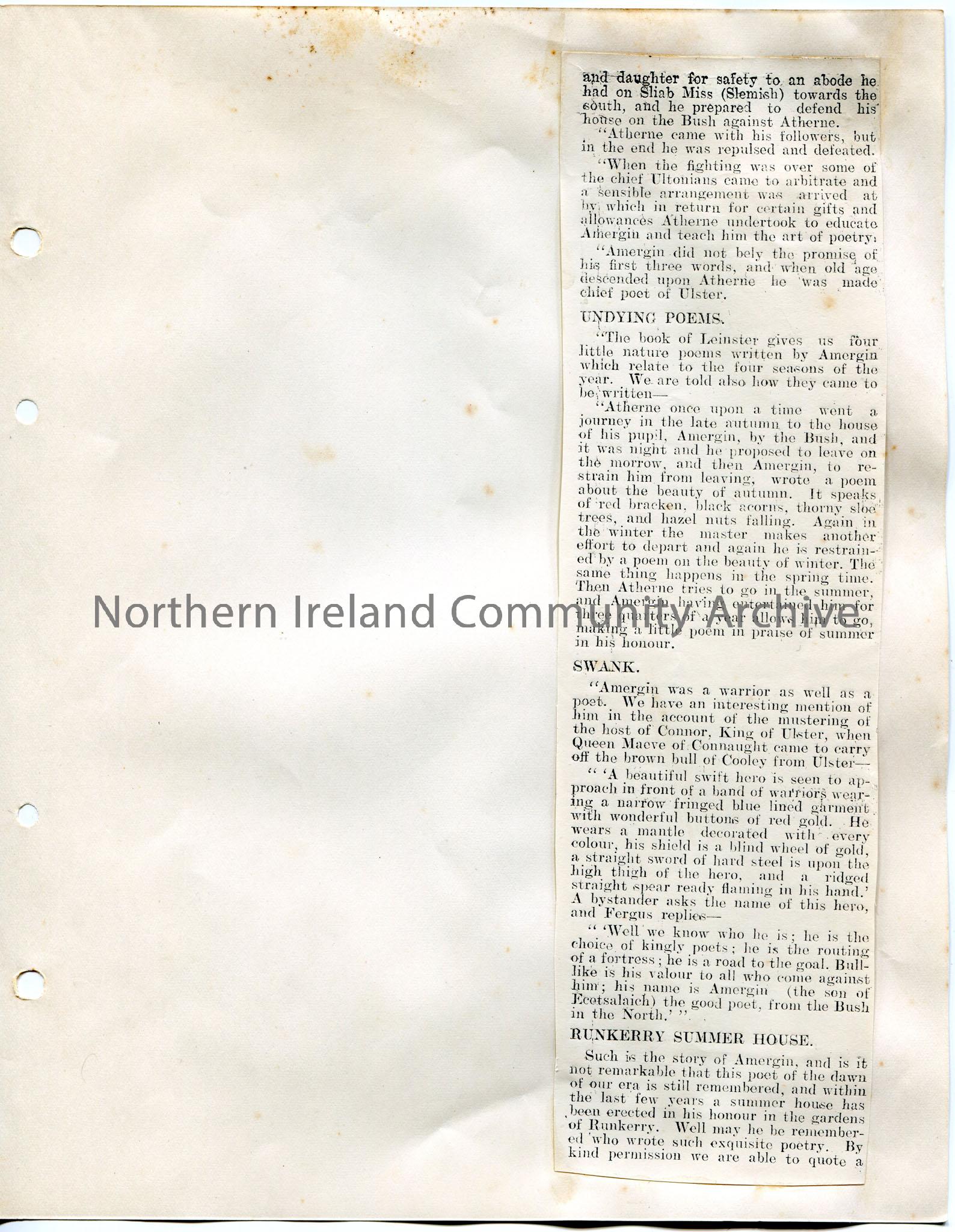 Page 1 of 2 of newspaper cuttings stuck to paper, no title. Not full article. Re book of Leinster, Atherne, the poet Amergin, Runkerry, Dalriada, Bushmills and the Spanish Armada. Features poem by Dr Douglas Hyde titled, 'The Year,' re the four seasons. Page 2 has two photographic images captioned, 'A Corner of the Still House at Bushmills Distillery' and 'Currie's Corn Mill at Bushmills.'