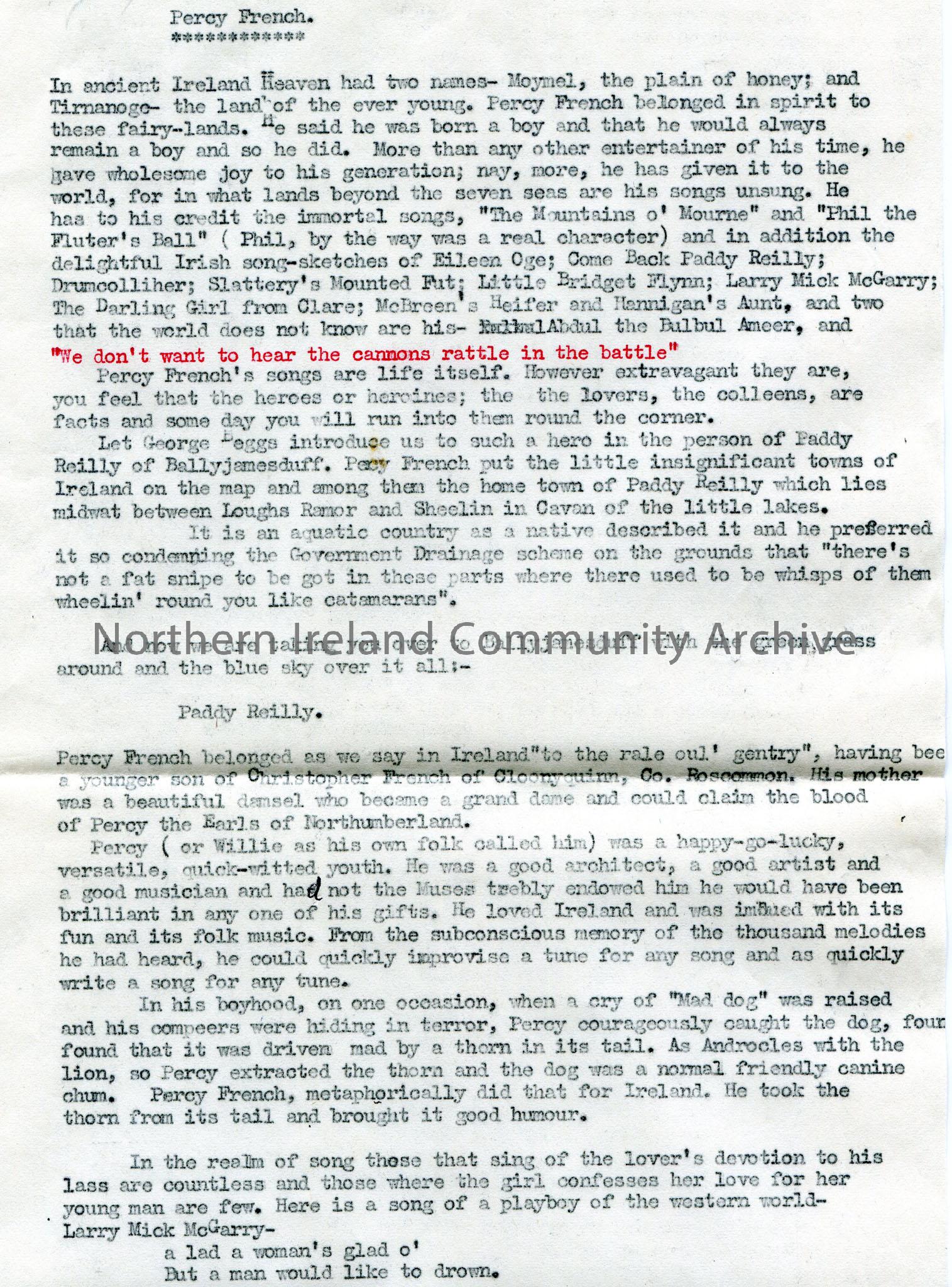 Page 1 of 2 of rough typed script for broadcast re the songs of Percy French. For the ‘Music of Britain’ broadcasts for the BBC North American program…