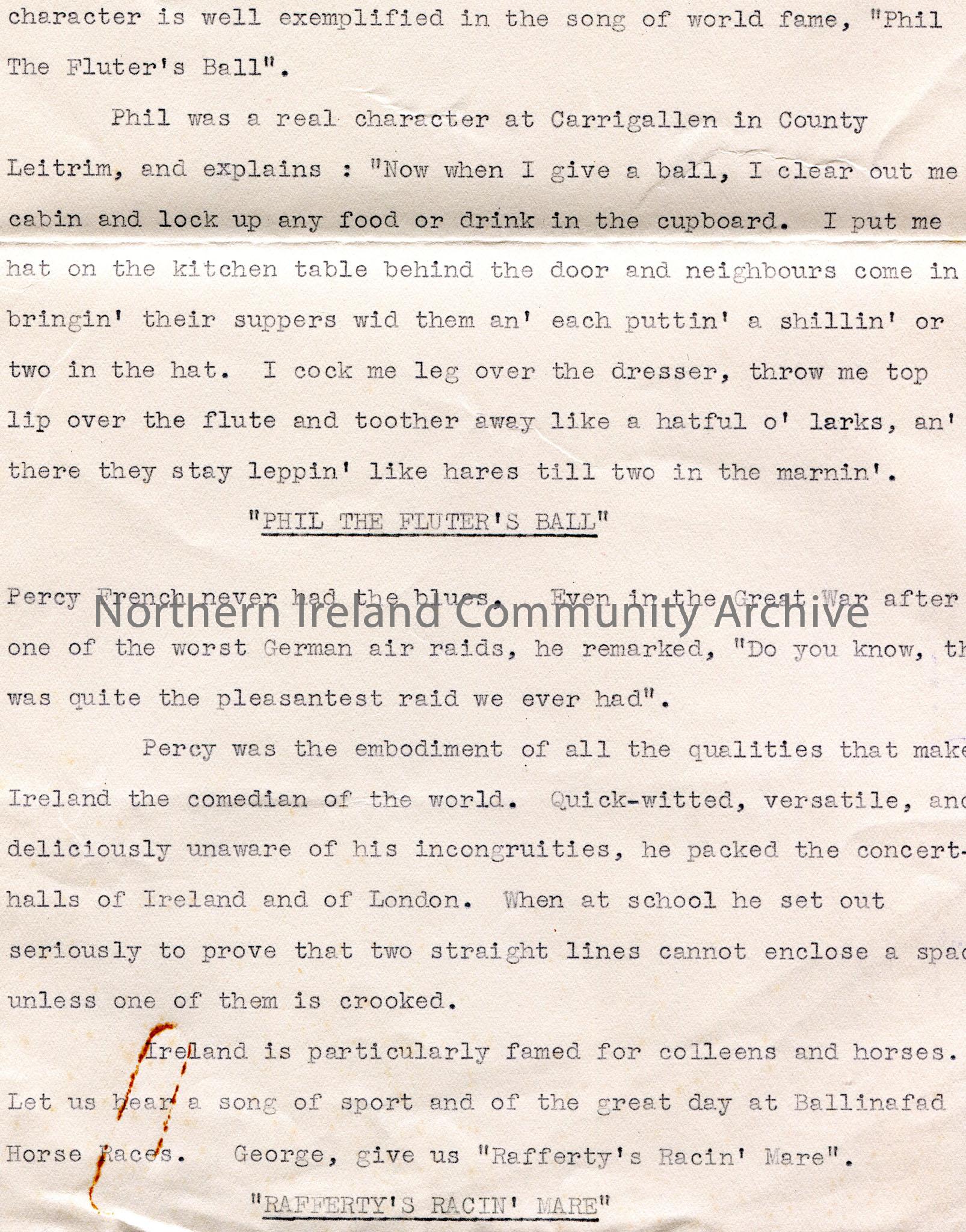 Page 1 of 2 of typed amended script from Ursula Eason of the BBC to Sam Henry. Script re Percy French for the BBC North American programme. Script was enclosed with letter - CM:2017:892.1.