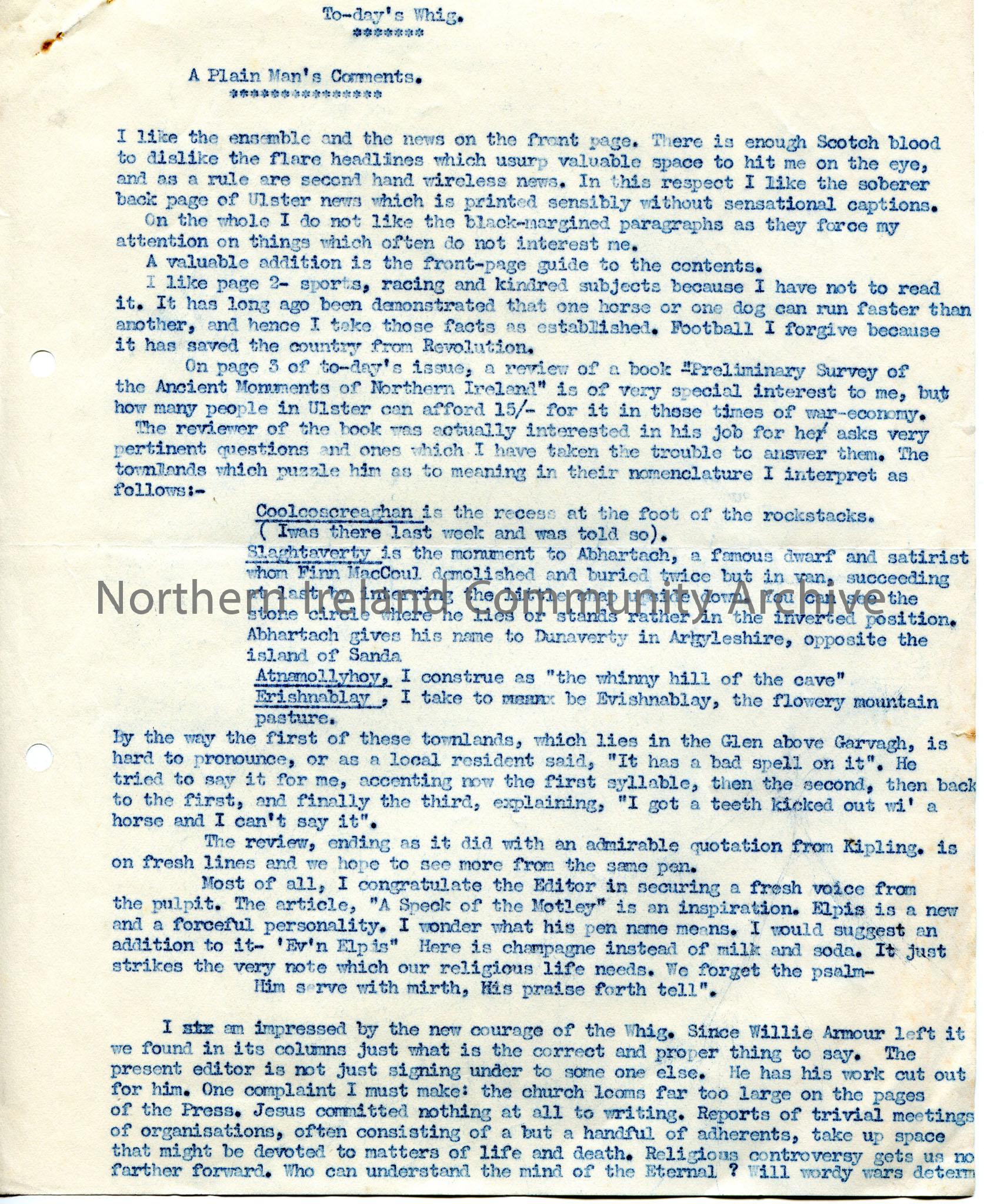 Page 1 of 2 of typed analysis of the Whig newspaper. Titled, 'Today's Whig. A Plain Man's comments'. Comments on each section of the paper. Mentions the following townlands - Coolcoscreaghan, Slaghtaverty, Atnamollyhoy and Erishnablay.