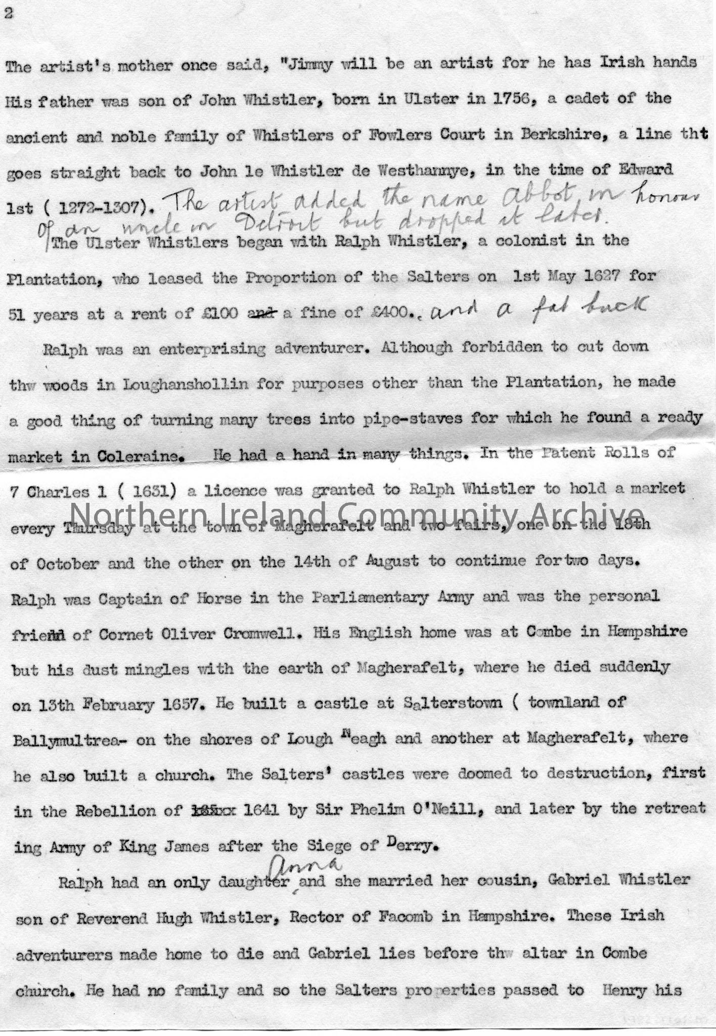 Page 1 of 2 of typed document re the family name Whistler. Possible part of a broadcast. Pages 2 and 3 of a genealogical history of the Whistler in Ulster. Other pages are missing. Pages are annotated in pencil.