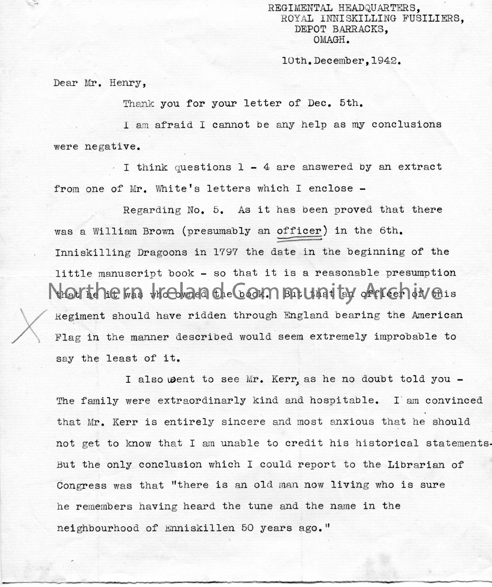 Page 1 of 2 of typed letter to Mr Henry. Writing re historical information re Inniskilling Dragoons / Fusiliers. Mentions going to see Mr Kerr who seems to remember the tune to 'The Star Spangled Banner' played in Enniskillen 50 years ago. Encloses extract from a letter from Mr White.