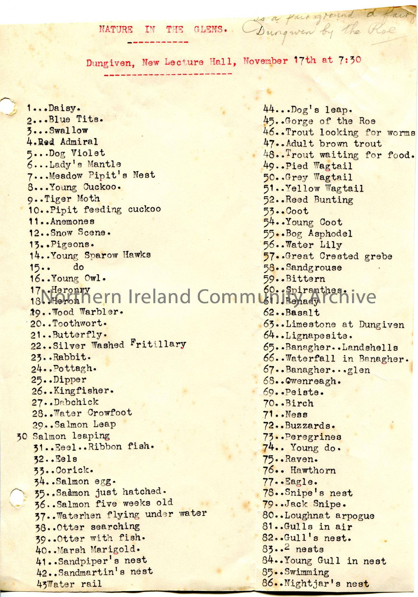 Page 1 of 2 of typed list of 105 slides for lecture titled, ‘Nature in the Glens’ at Dungiven, New Lecture Hall on 17th November, at 7:30pm. First sli…