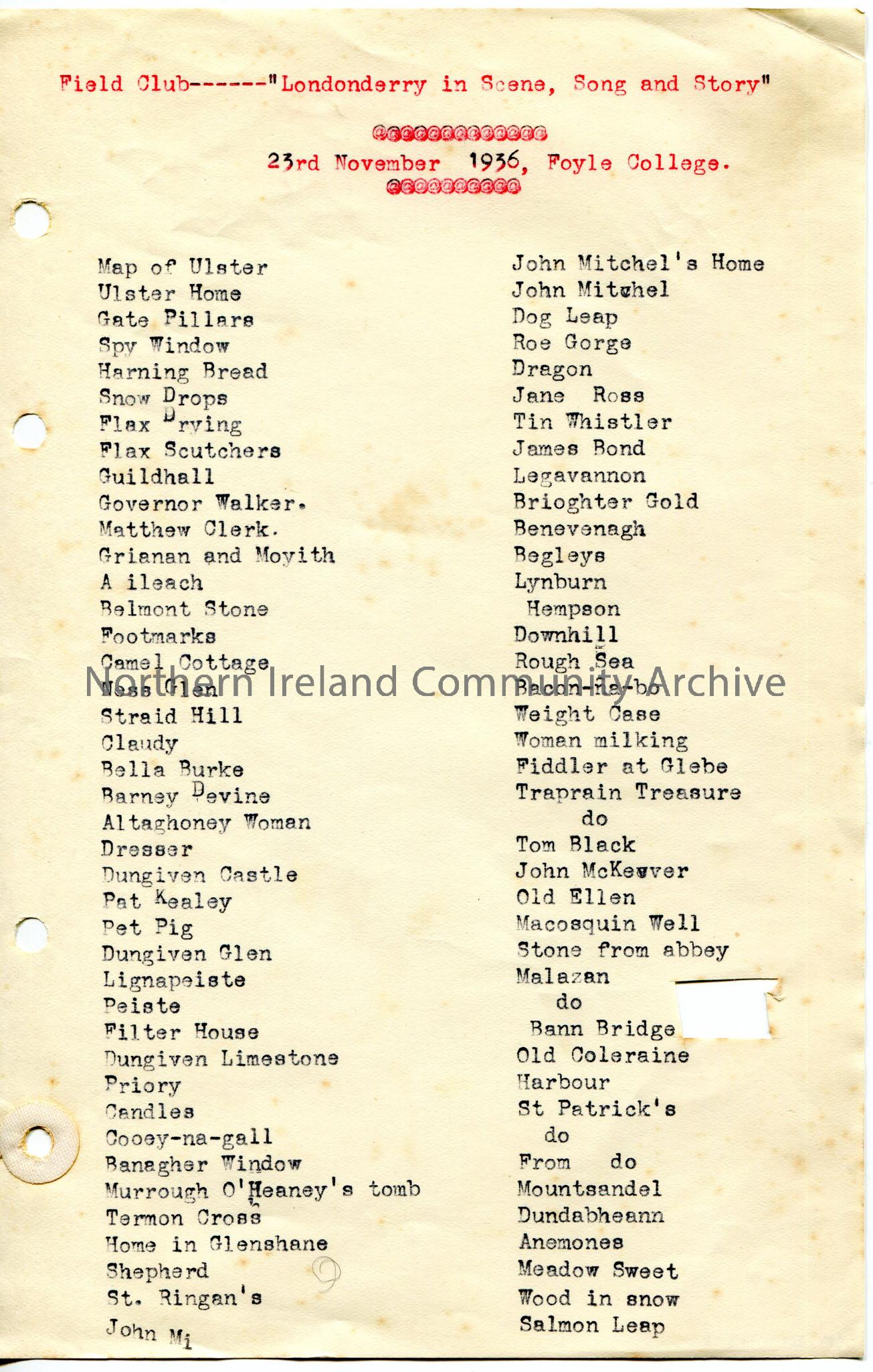 Page 1 of 2 of typed list of slides used for lecture. Titled, ‘Field Club——“Londonderry in Scene, Song and Story”. At Foyle College on 23rd Novemb…