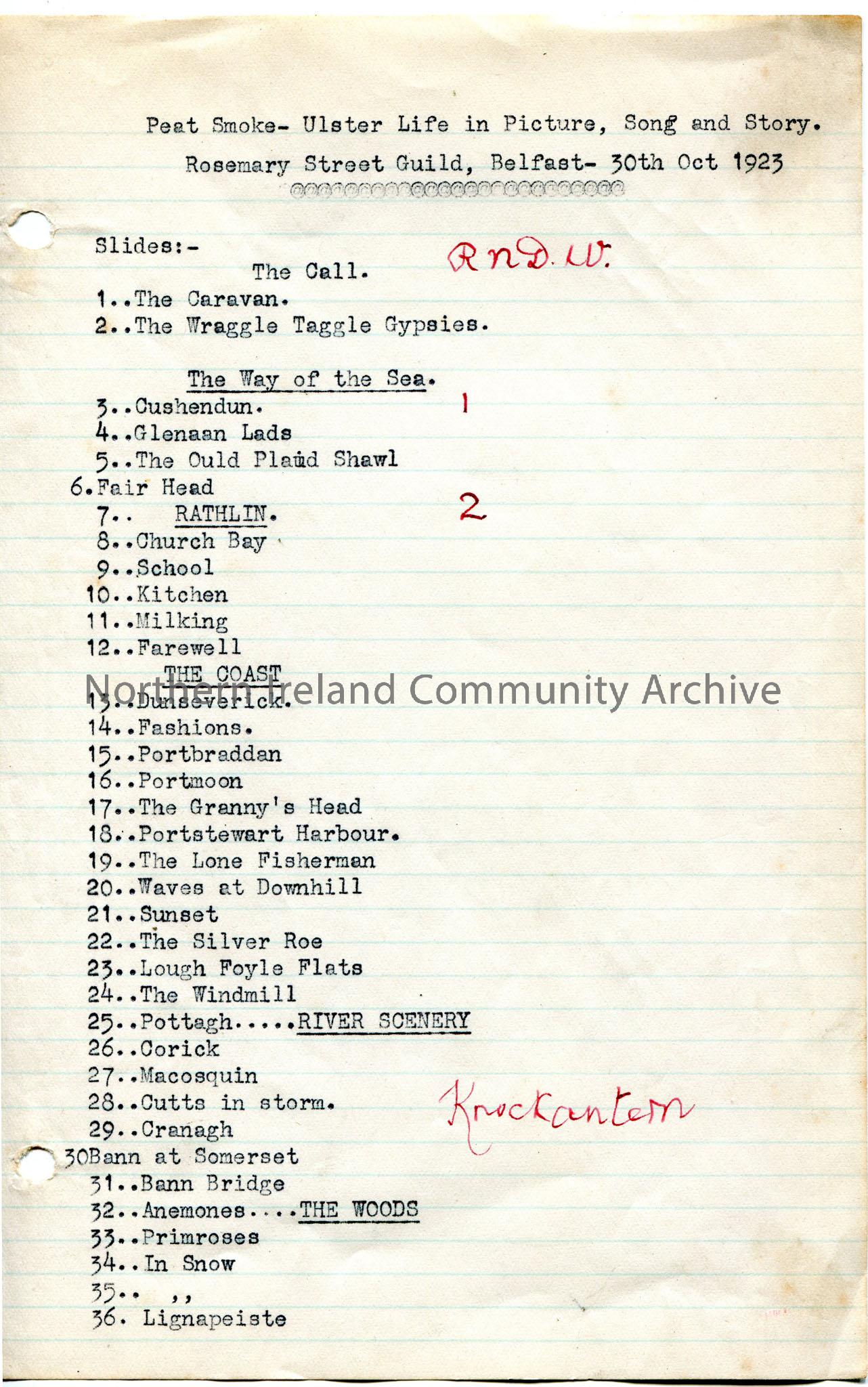 Page 1 of 2 of typed list of slides used in a lecture. Page is titled, ‘Peat Smoke – Ulster Life in Picture, Song and Story. Rosemary Street Guild, Be…