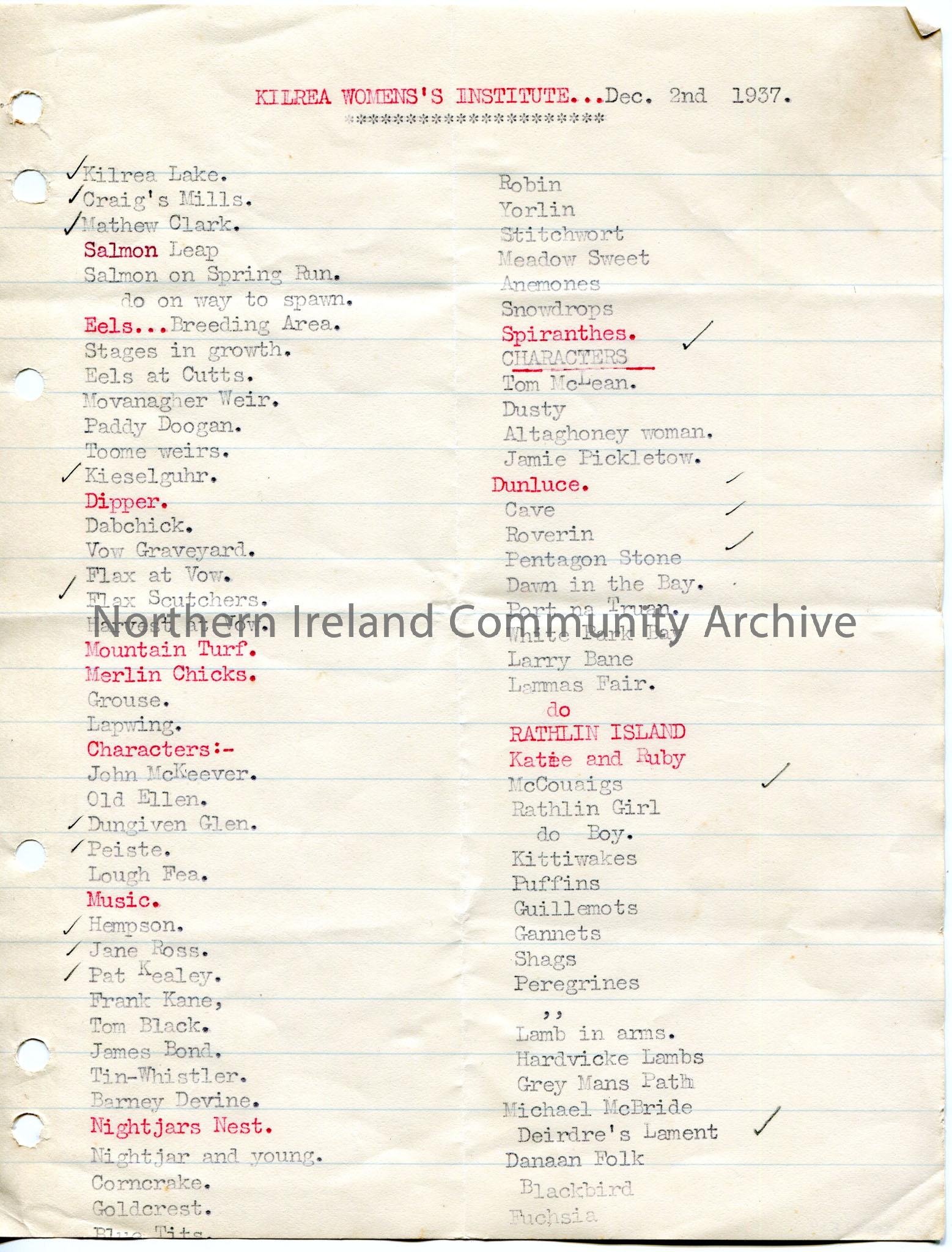 Page 1 of 2 of typed list of various topics for a lecture. Titled, 'Kilrea Women's Institute'. Dated 2nd December, 1937. Salmon, eels, Characters, music, Dunluce, Rathlin Island and archaeology on the second page. Various ticks in pencil beside some words on the list.